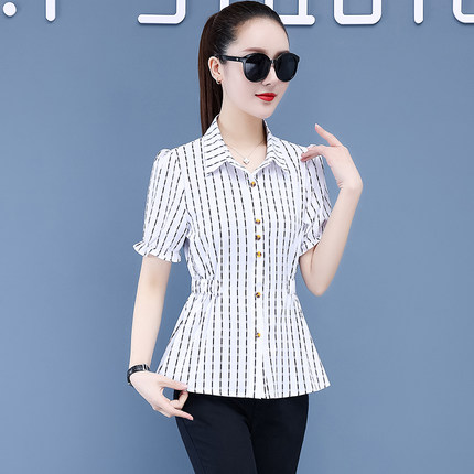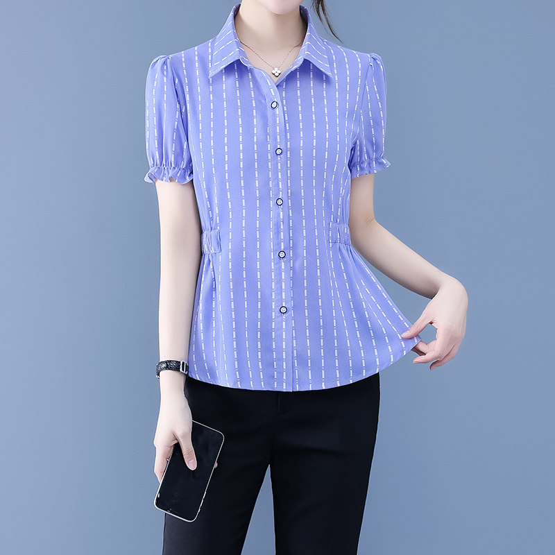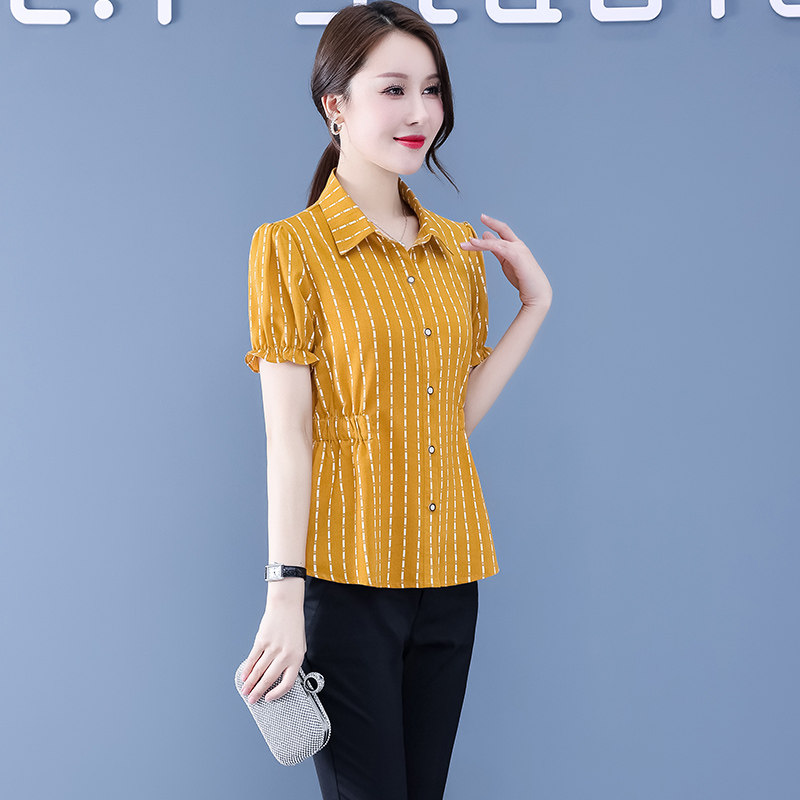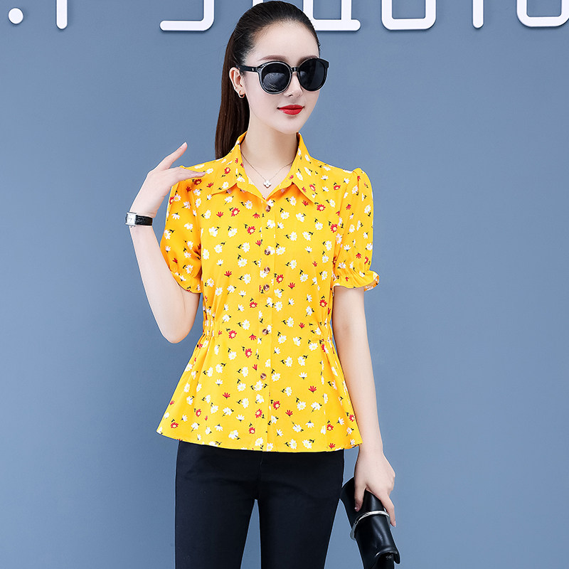 女士衬衫女短袖夏季新款洋气韩版时尚气质翻领印花衬衣大码雪纺衫
