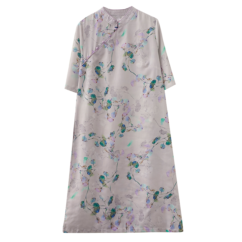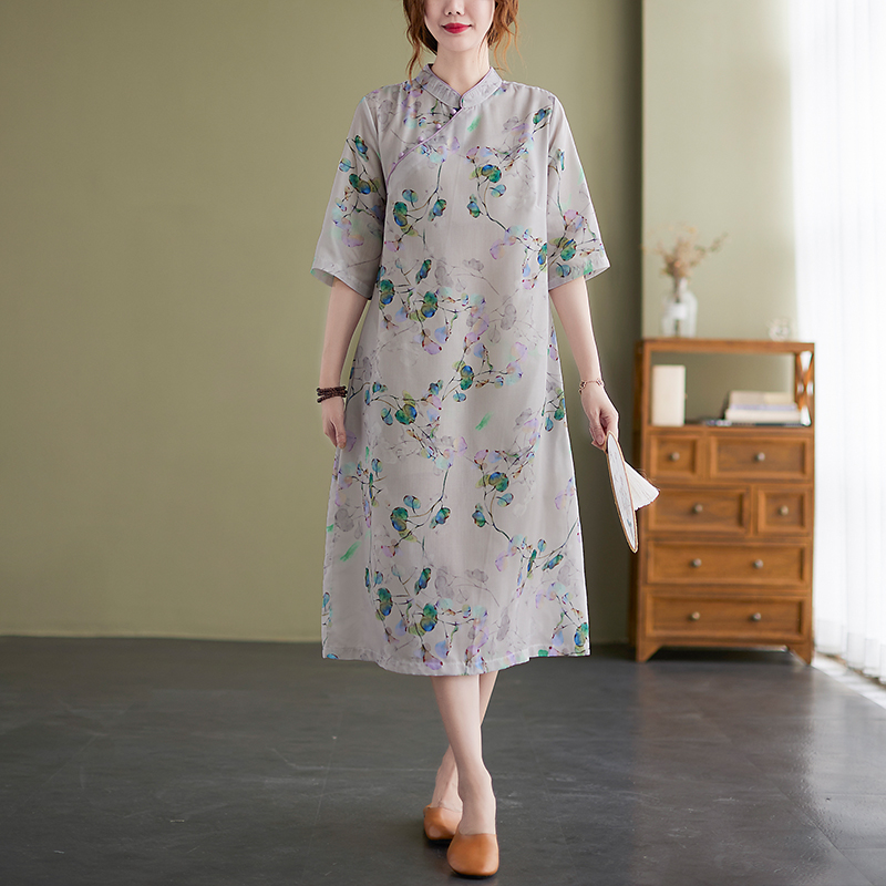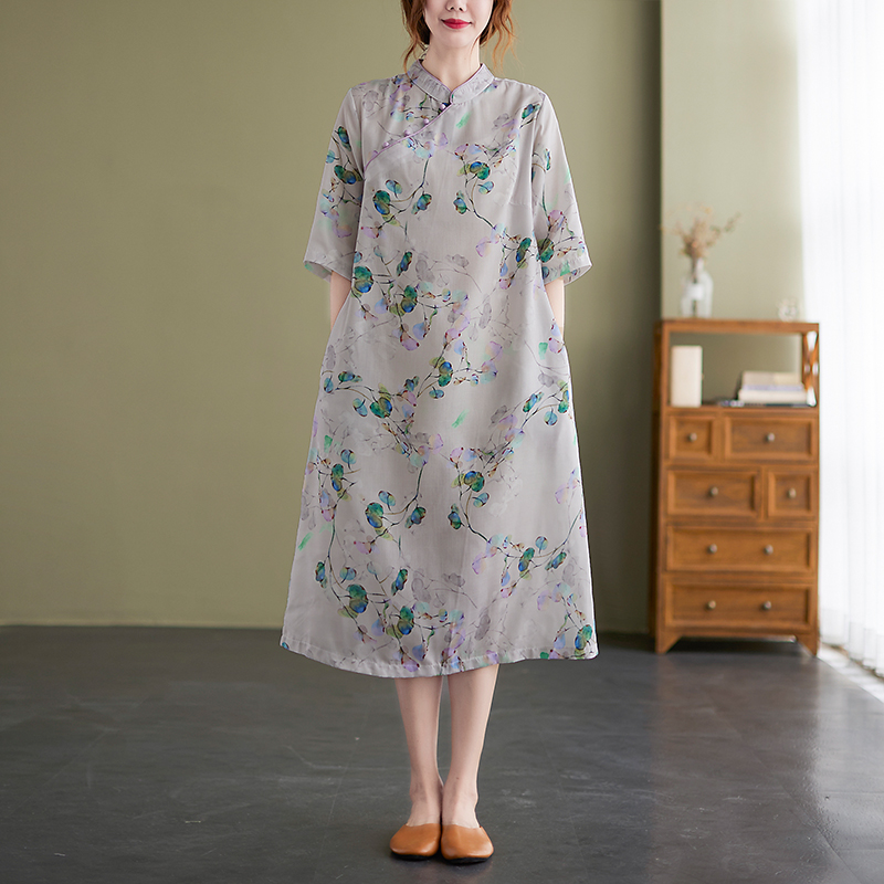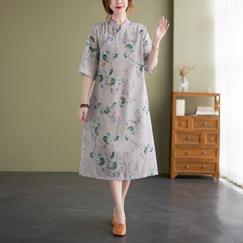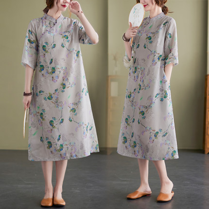 2024夏季新款复古斜襟盘扣改良旗袍裙女中长款棉麻短袖显瘦连衣裙