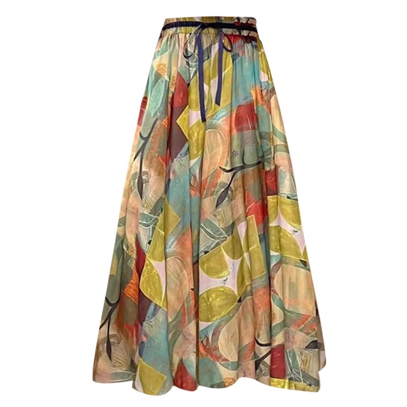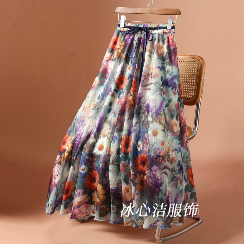 高腰大摆印花雪纺半身裙女夏季2025新款绑带波西米亚沙滩裙子长裙