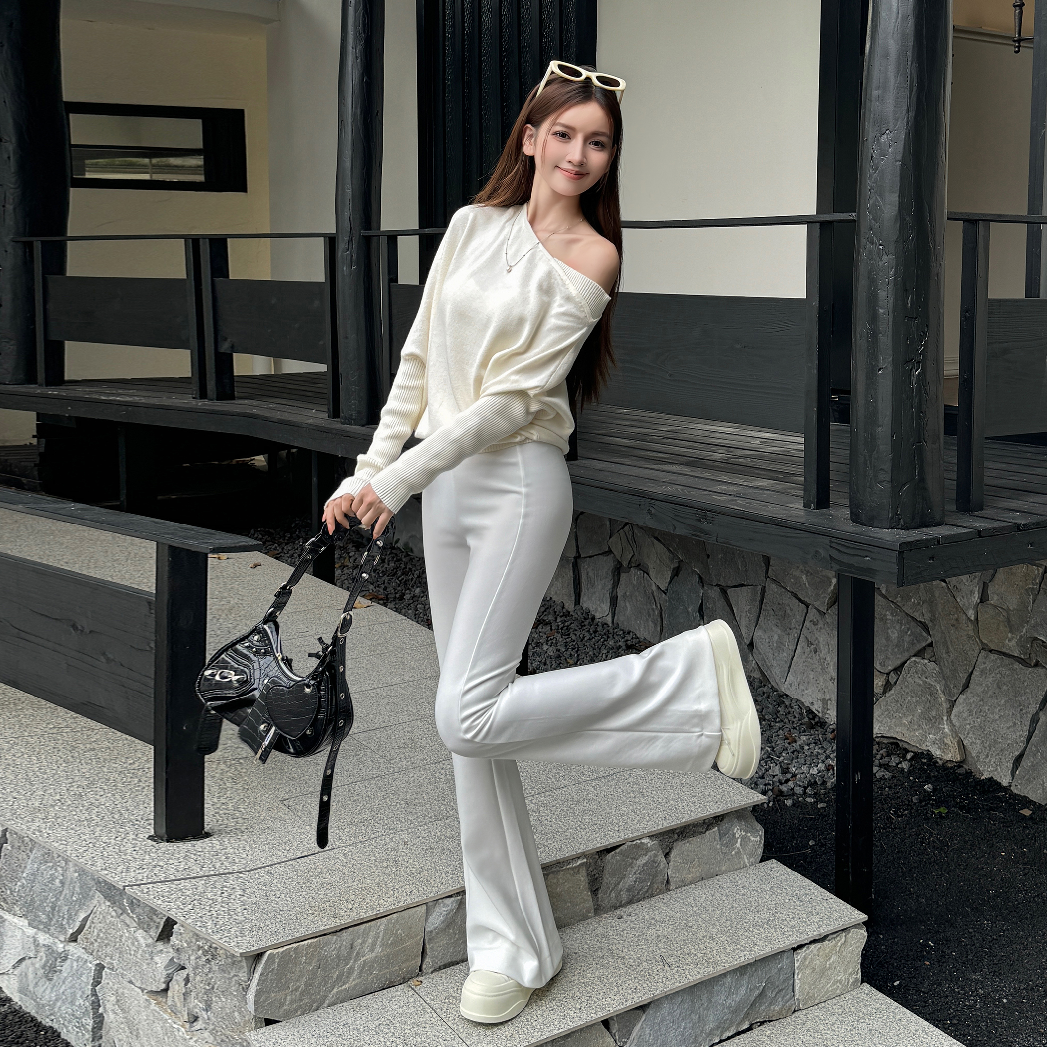 浅布调秋季新款慵懒风一字领露肩山羊绒毛衣长袖内搭斜肩针织上衣