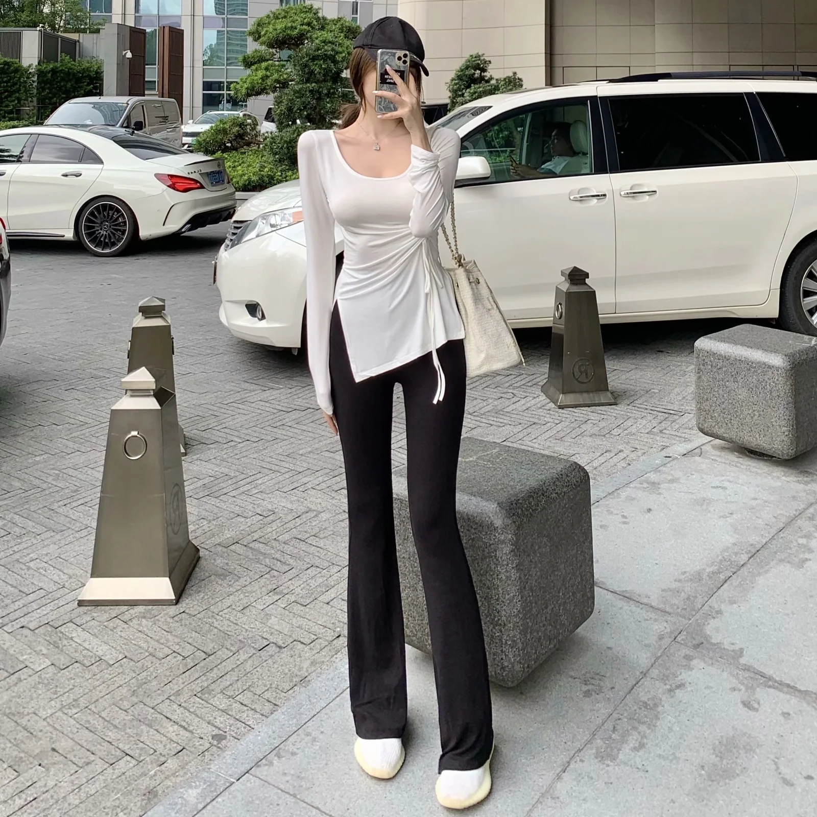 新款垂坠感休闲裤子长裤连体辣妹高腰修身显瘦微喇叭裤铅笔春季女