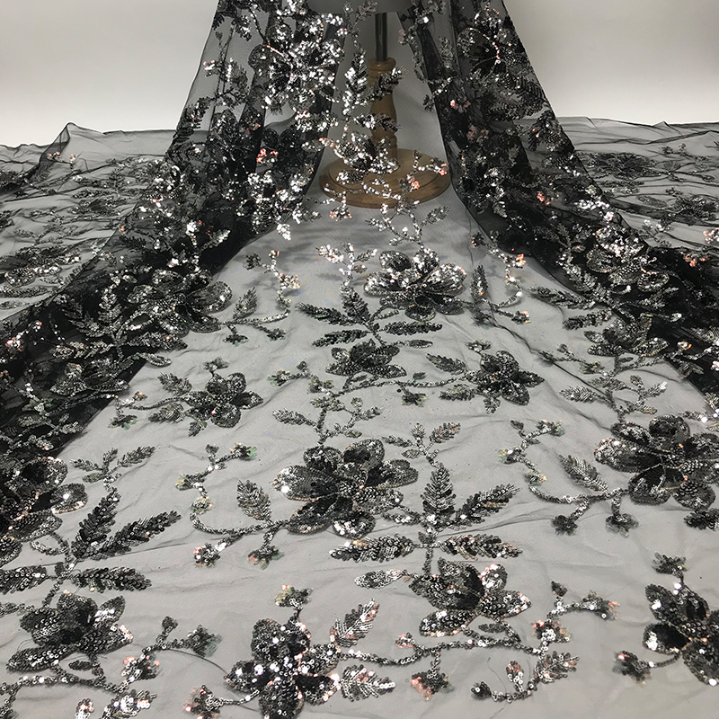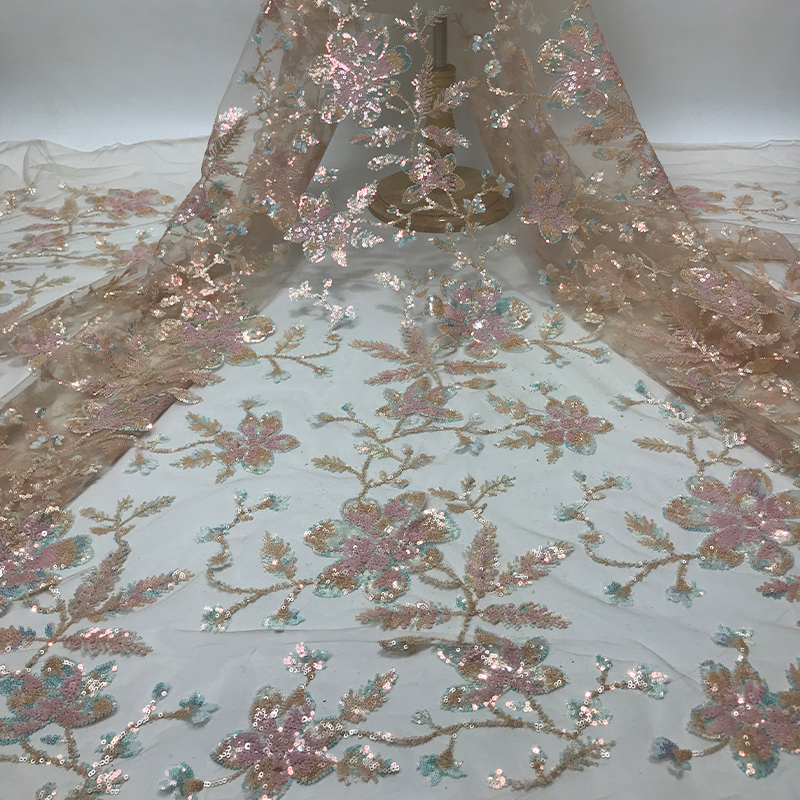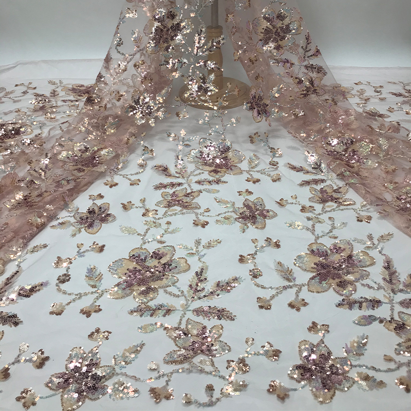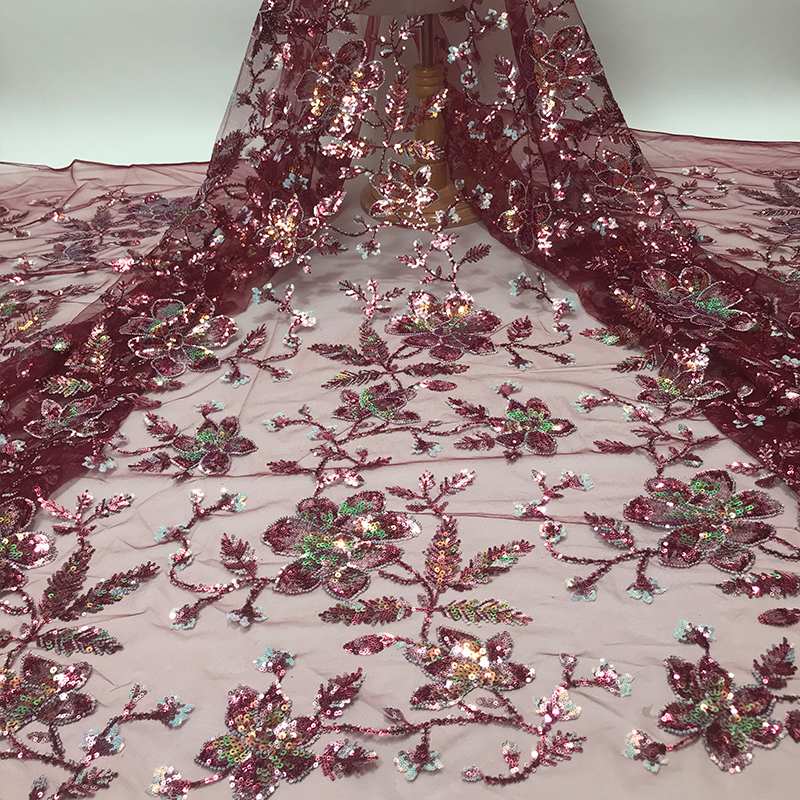 红色蕾丝网纱精致密珠片布料大花叶子亮片刺绣礼服婚纱连衣裙童装