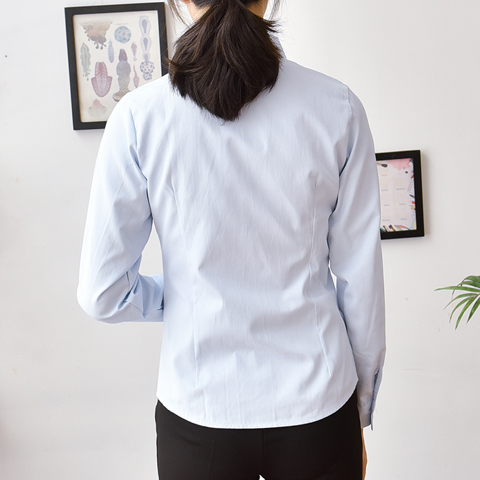 秋季新款女长袖衬衫浅蓝翻领职业装棉工装衬衣收腰方领条纹