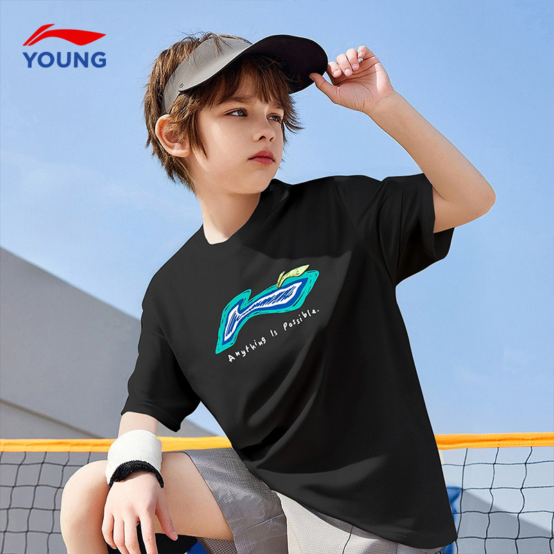 李宁男童短袖t恤2026新款男女大童透气吸汗纯棉半袖儿童黑色T恤衫