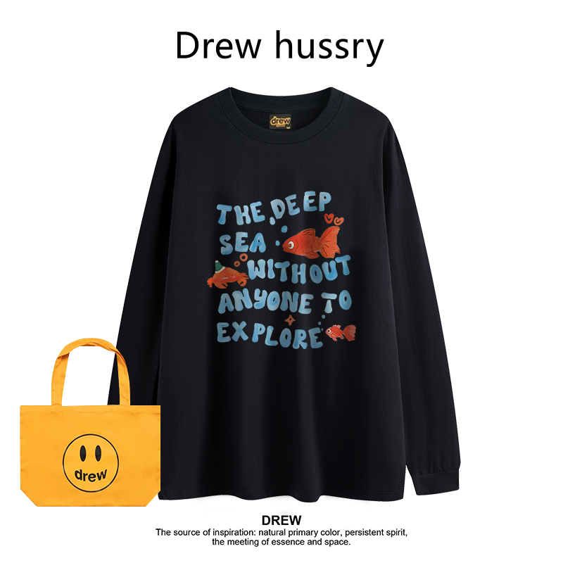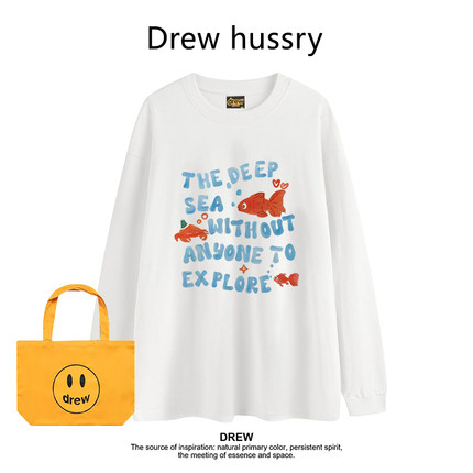 Drew美式潮牌卡通小鱼印花春秋打底衫圆领正肩长袖T恤男女款上衣