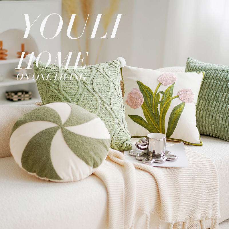 绿色网红郁金香靠枕可爱少女粉色花朵抱枕套刺绣客厅沙发靠背靠垫