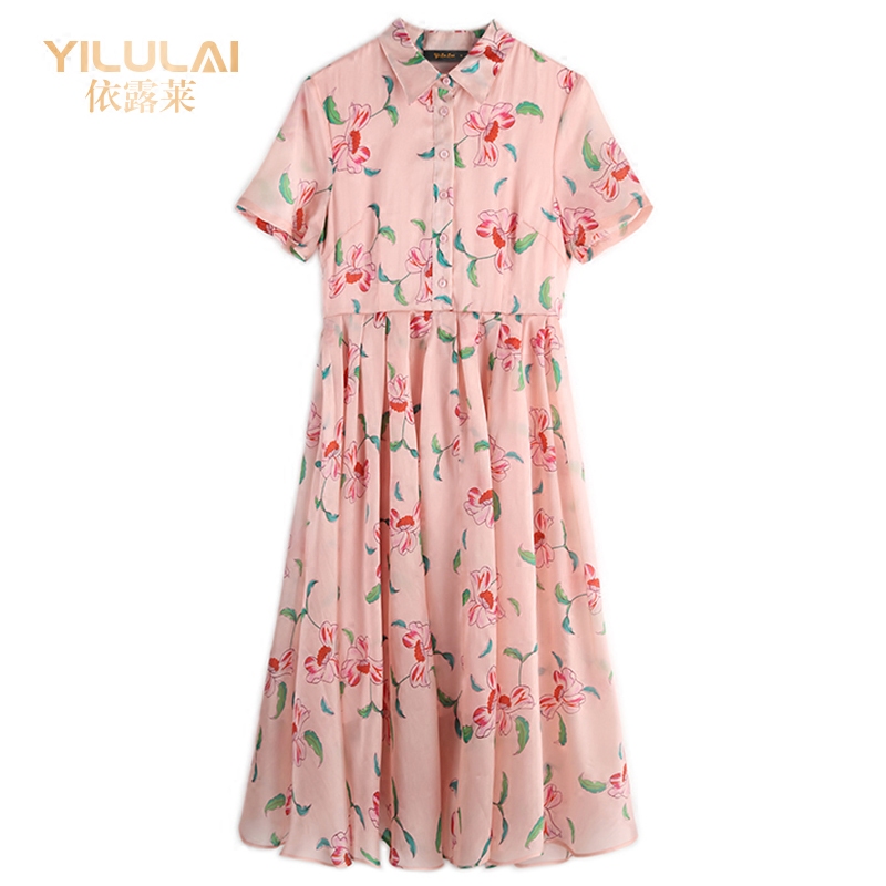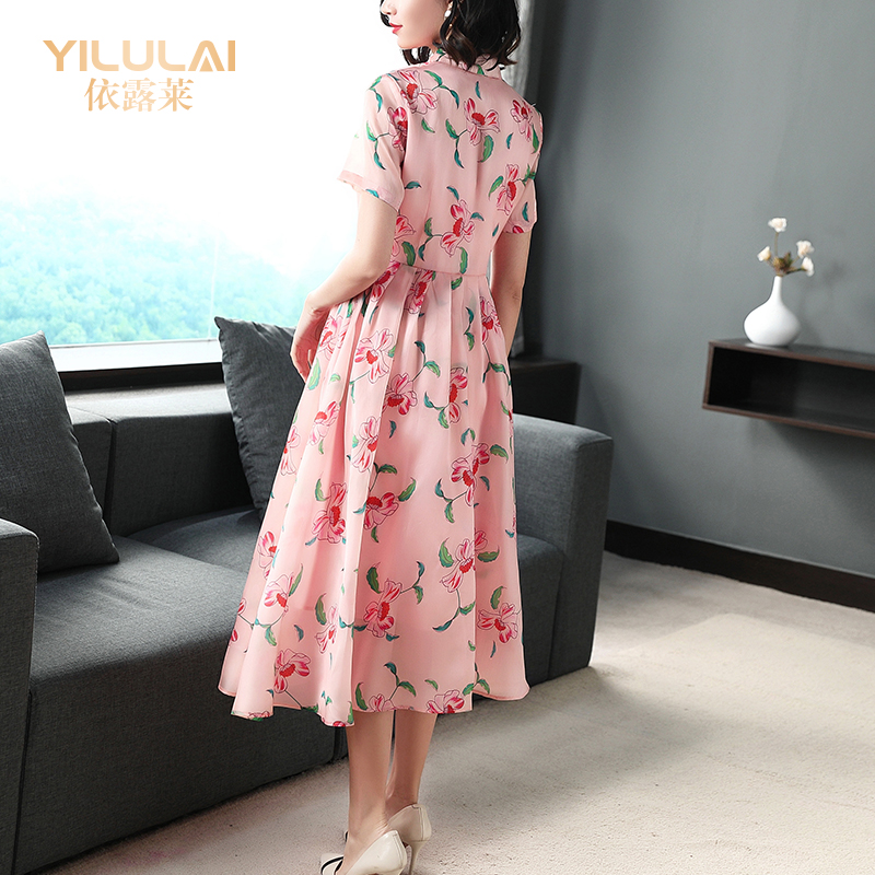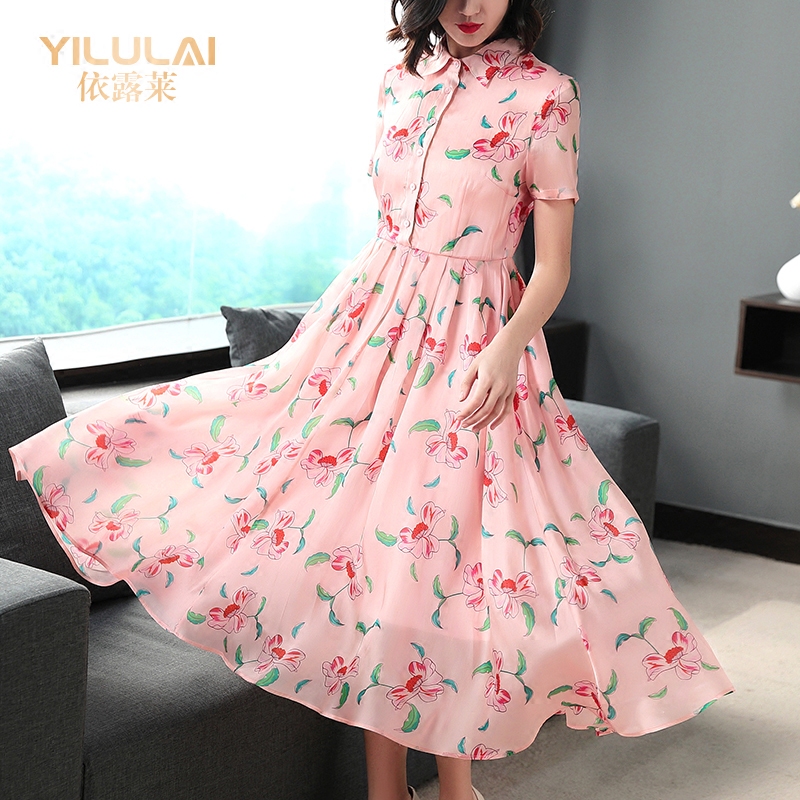 真丝碎花连衣裙女欧美气质高腰显瘦A字裙中长款桑蚕丝大摆裙子夏