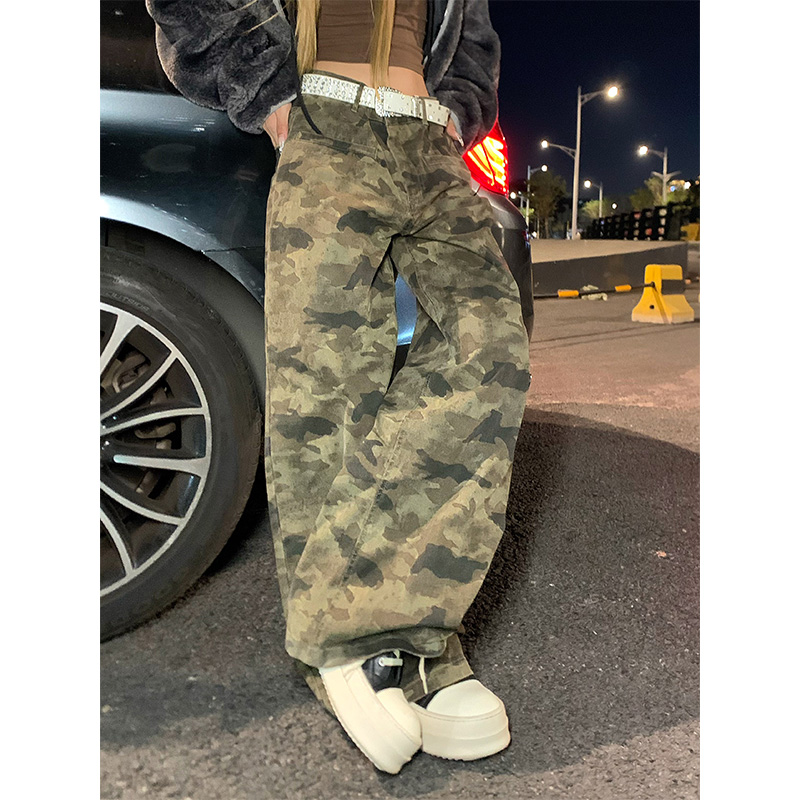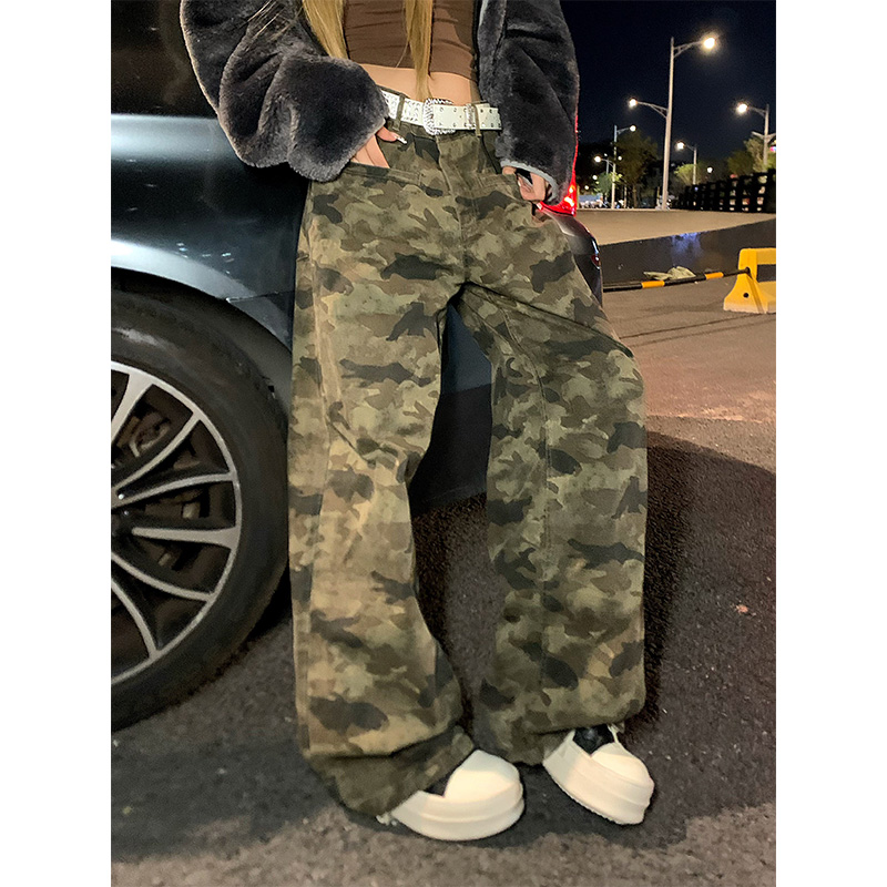 NECOYEP 2025美式复古迷彩阔腿工装裤男女宽松简约高街直筒长裤