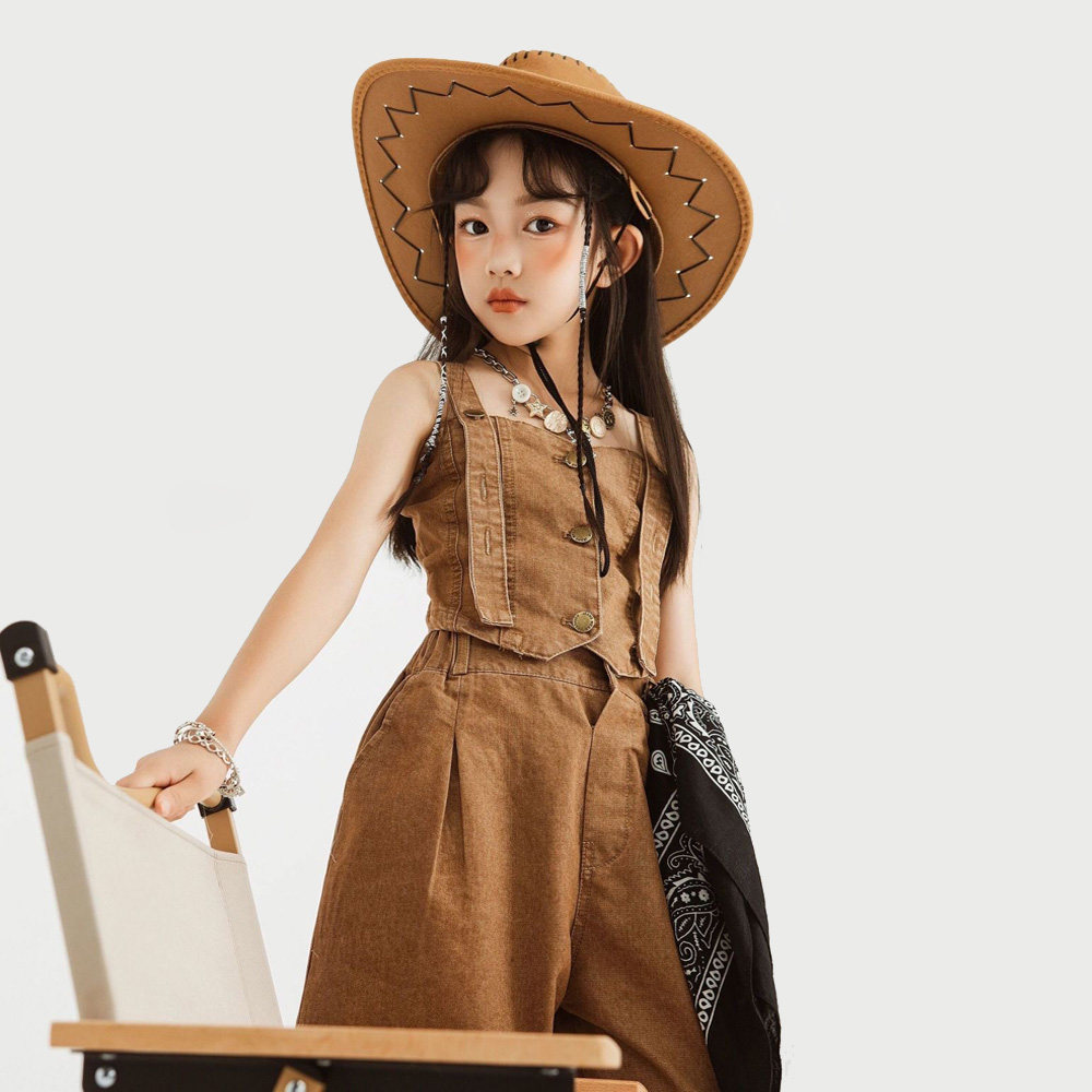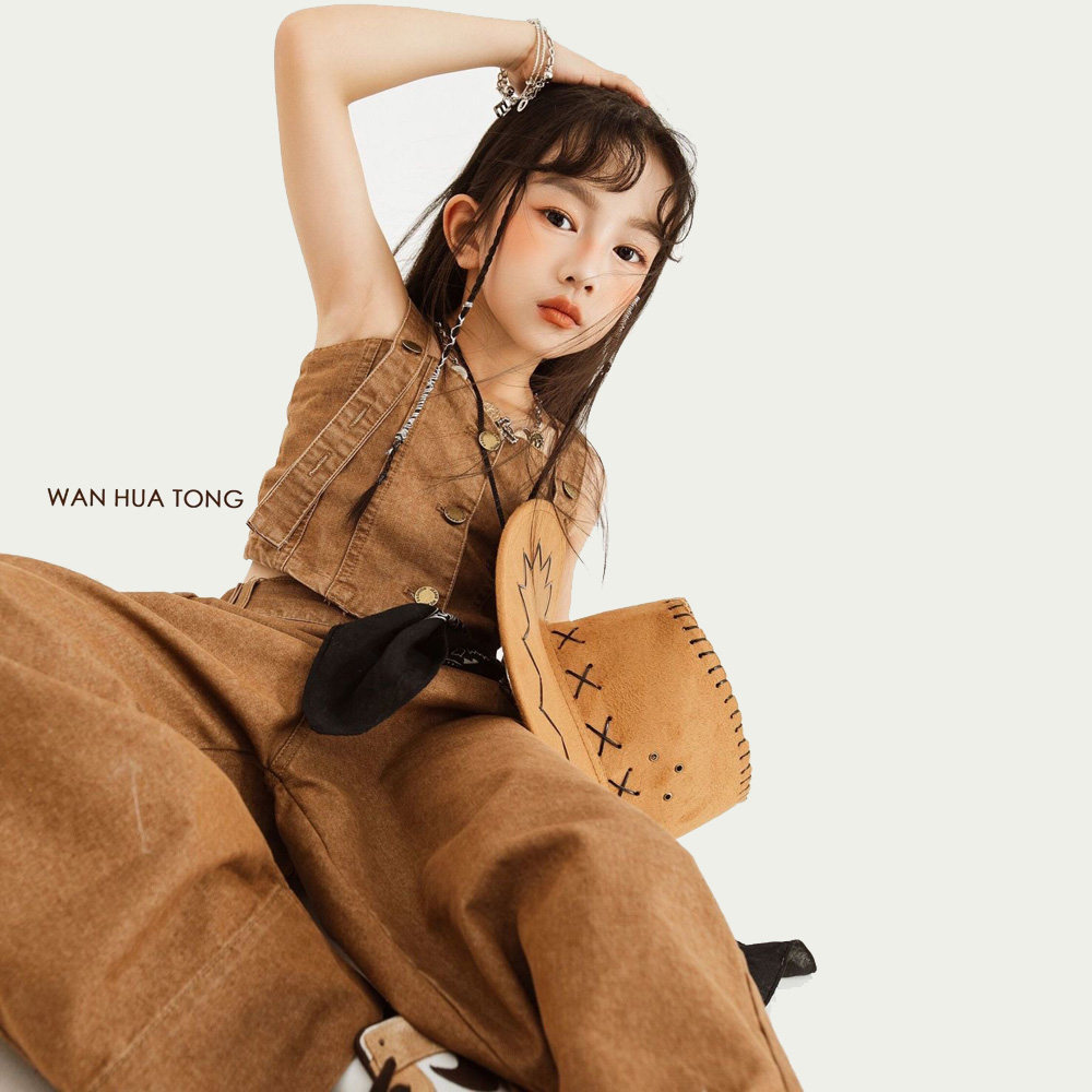 洋气咖色牛仔女孩套装 儿童影楼拍照服装 杂志风时尚模卡走秀套装
