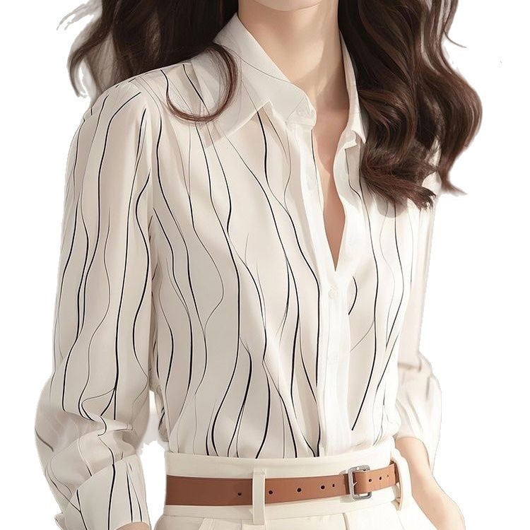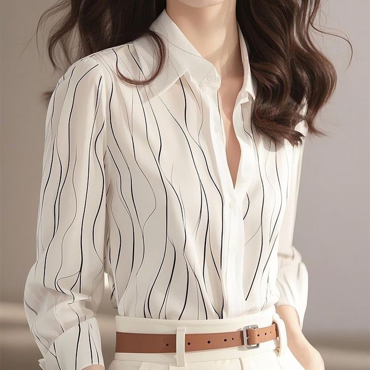 法式绝美优雅风白色印花翻领长袖衬衫女春秋新款洋气通勤遮肉衬衣