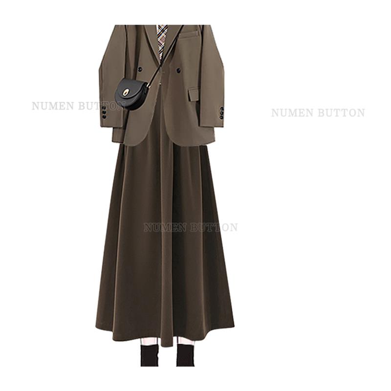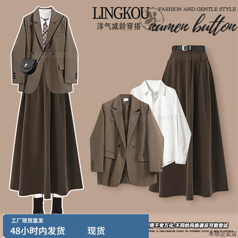 大码秋季学院风套装女减龄西装外套打底衫搭高腰显瘦半身裙三件套