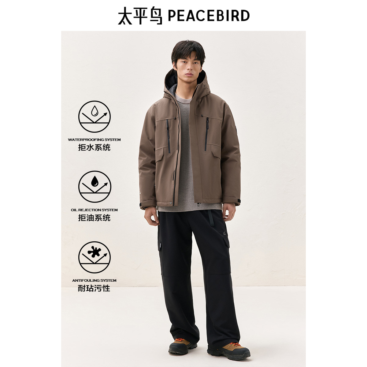 【三防】太平鸟男装工装户外羽绒服冬季连帽滑雪防寒服