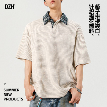 男士针织短袖polo衫男款痞帅高级感2025新款格子拼接上衣翻领t恤