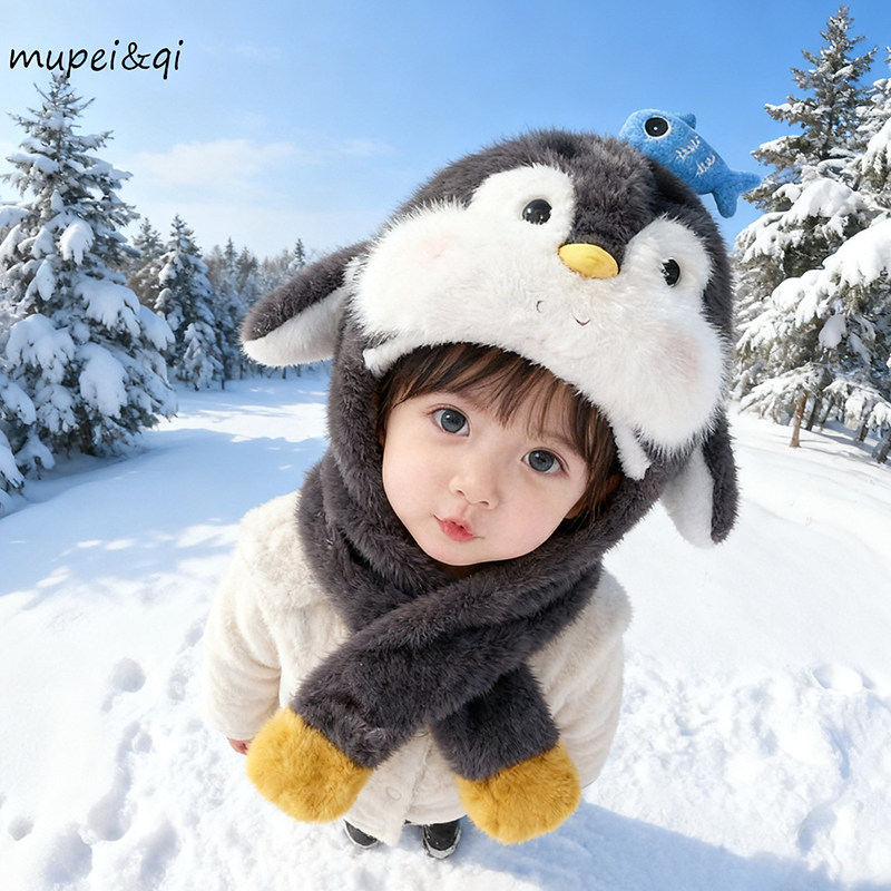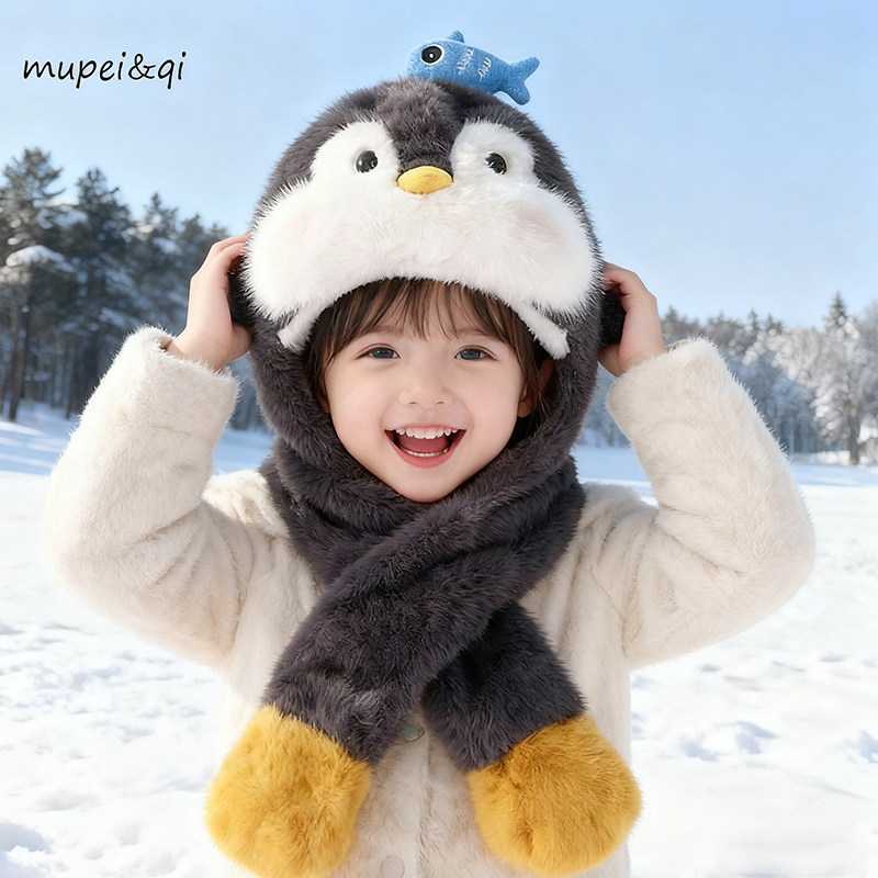 儿童可爱企鹅毛绒帽围巾一体会动的冬季加绒保暖护耳帽男女童帽子