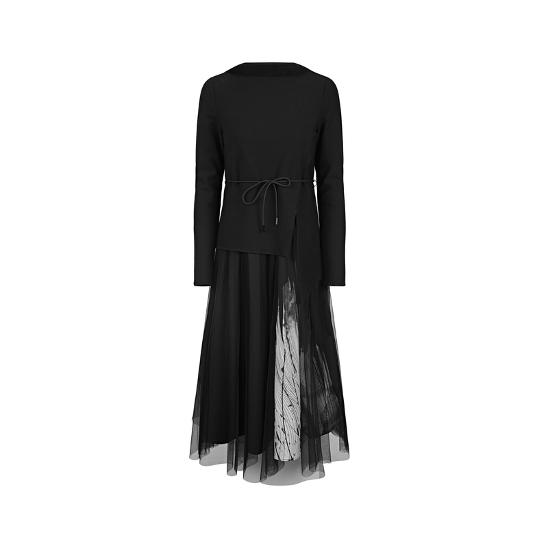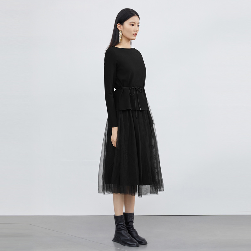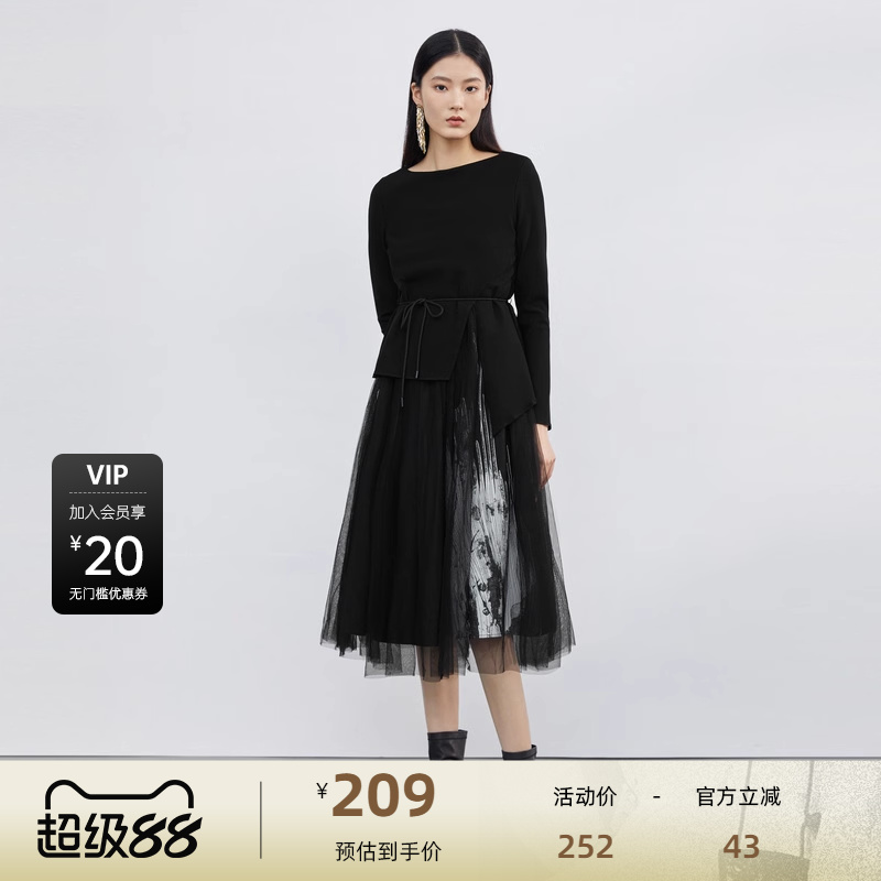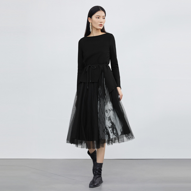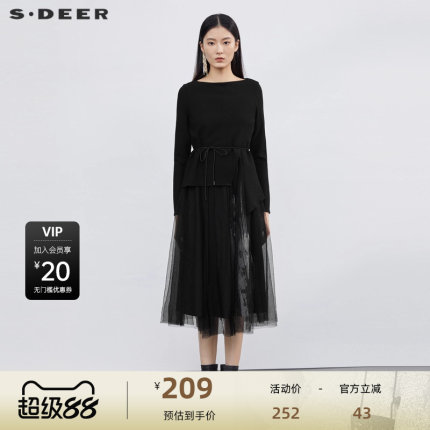 sdeer圣迪奥女装一字领晕染印花网纱拼接收腰连衣裙S21461234