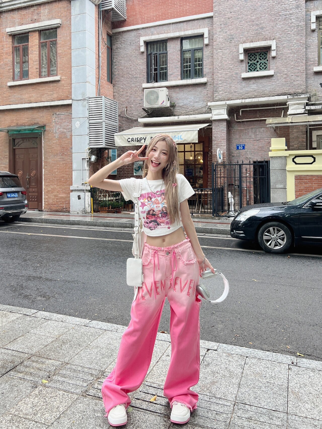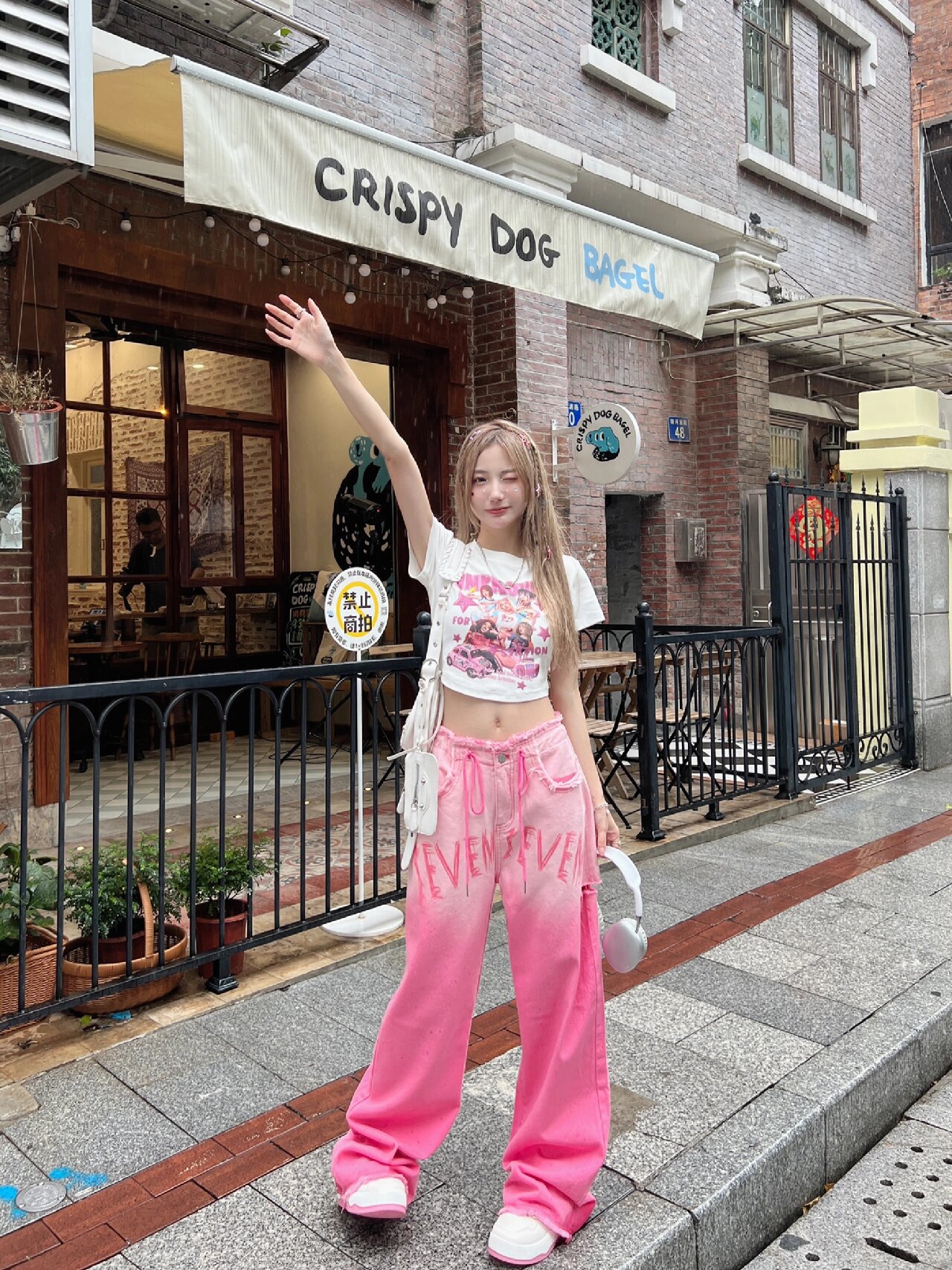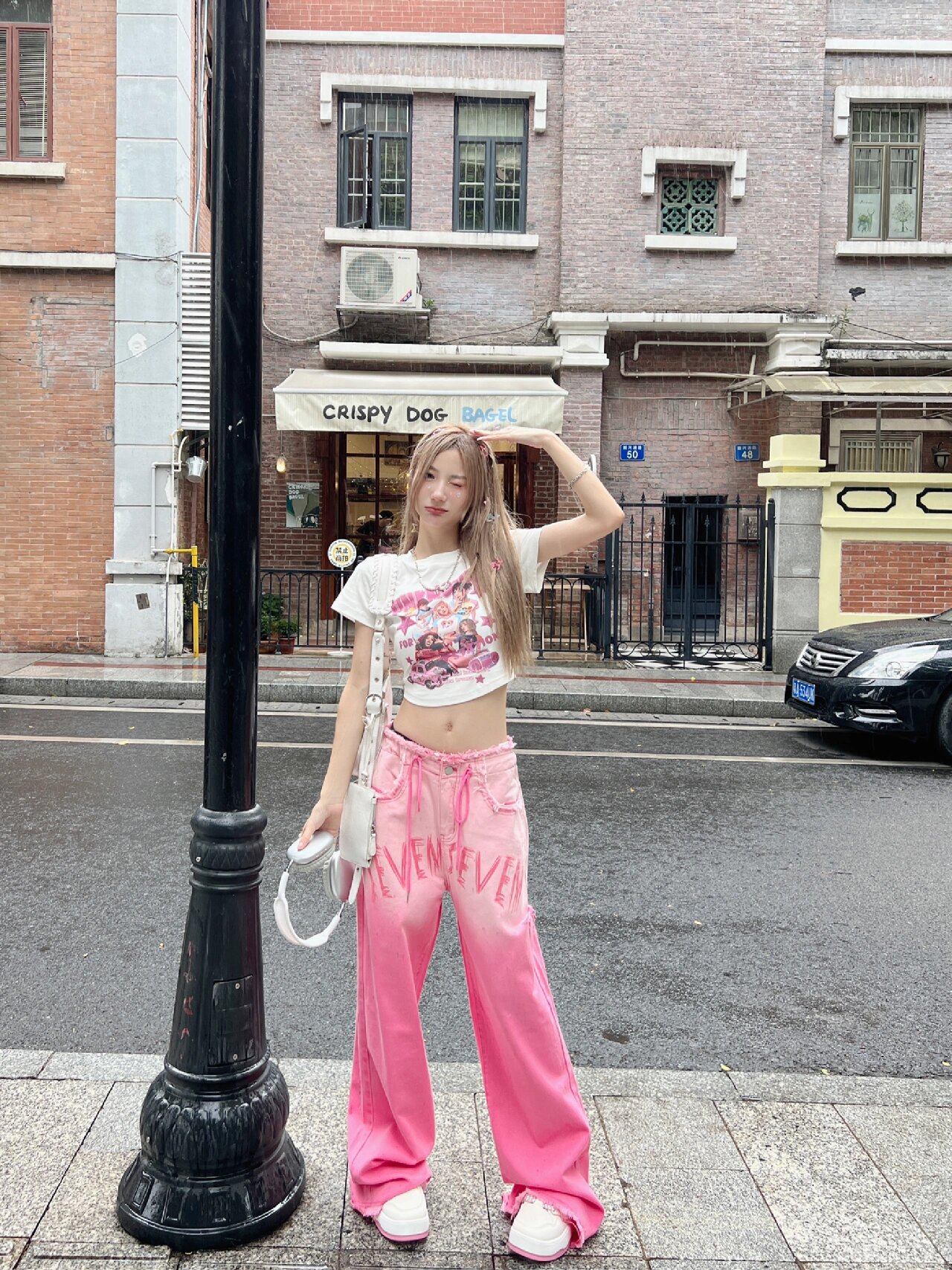 美式甜辣风女团印花T恤女夏季短袖正肩辣妹修身短款露脐上衣ins潮