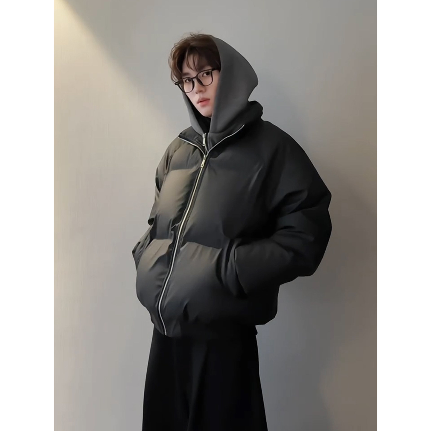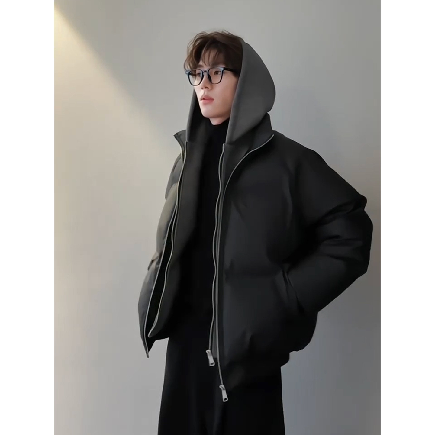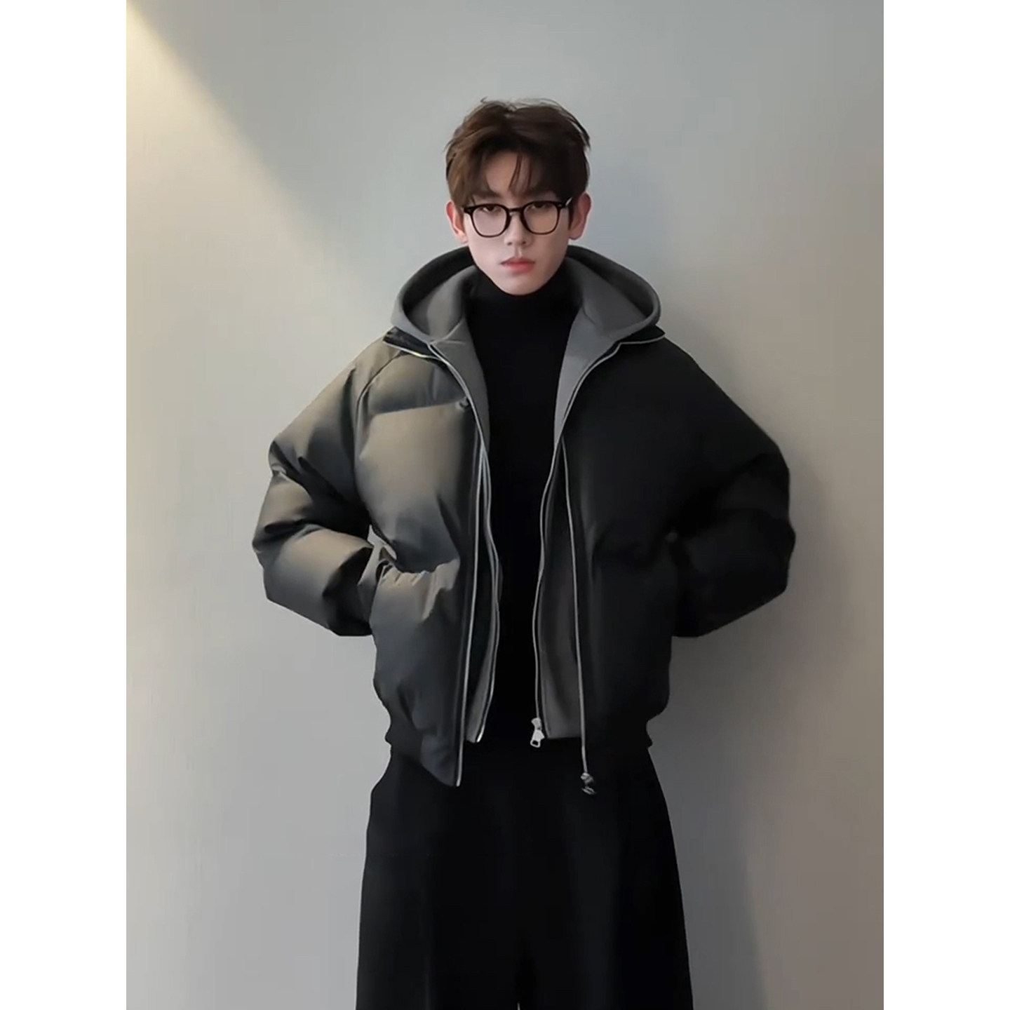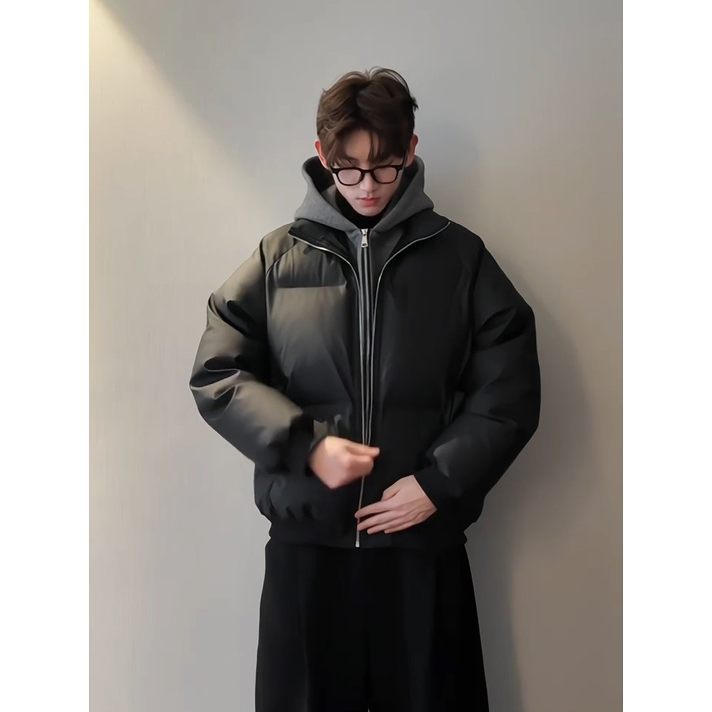 黑色假两件pu皮羽绒棉服冬季男款