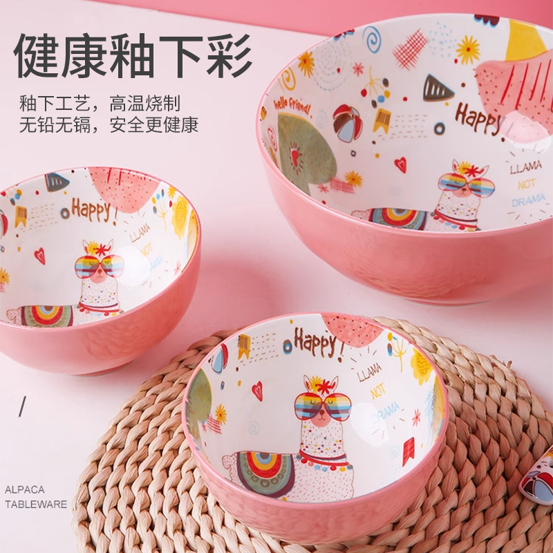 羊驼周末米饭碗可爱卡通创意家用菜盘子双耳网红陶瓷餐具碗盘套装