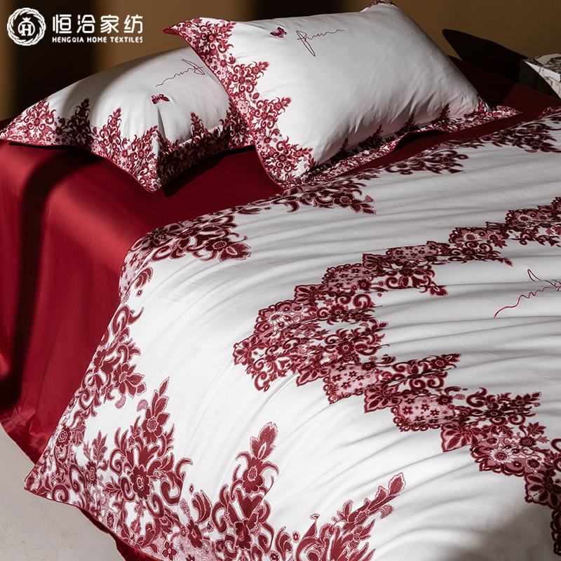 高级感婚庆超柔全棉四件套轻奢刺绣印花纯棉结婚红色被套床上用品