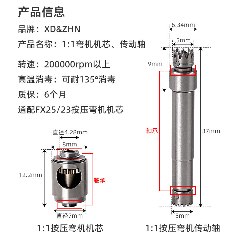 牙科手机通配FX25/23按压弯机机芯 传动轴1:1弯机机芯配件组件