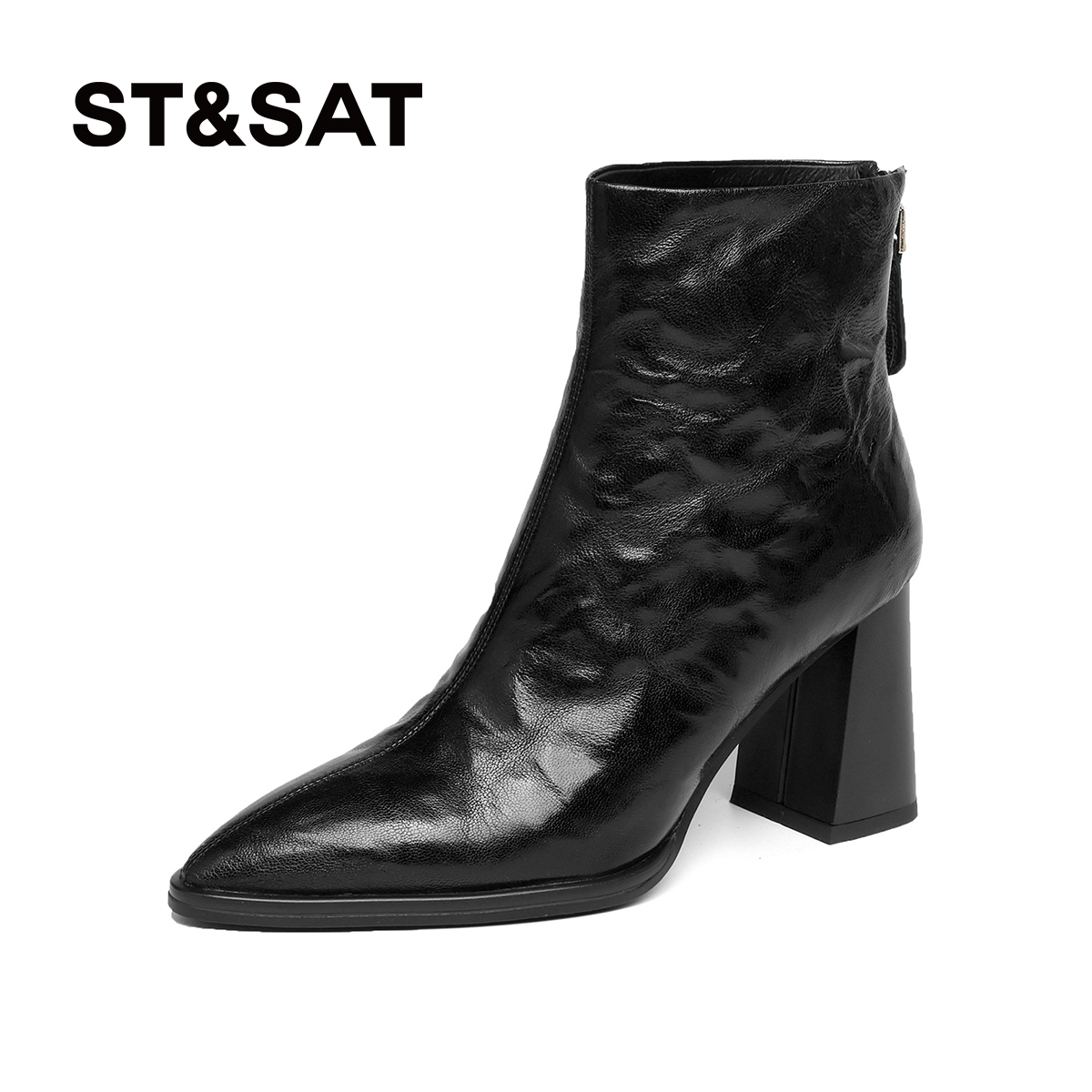 【舒适羊皮】星期六时装靴高级感2025年秋冬黑色高跟短靴女