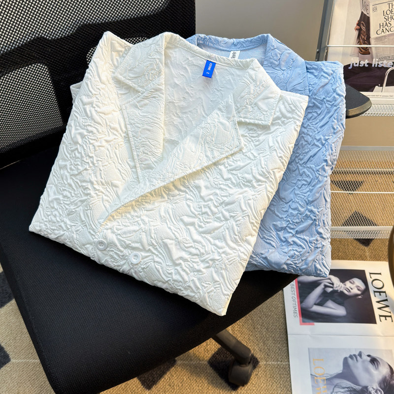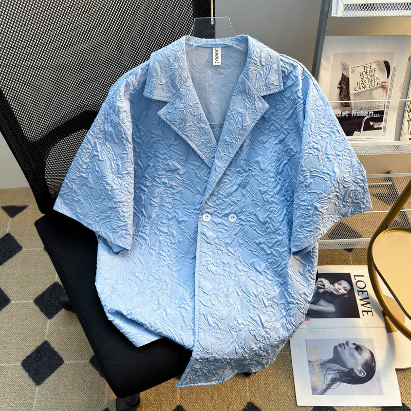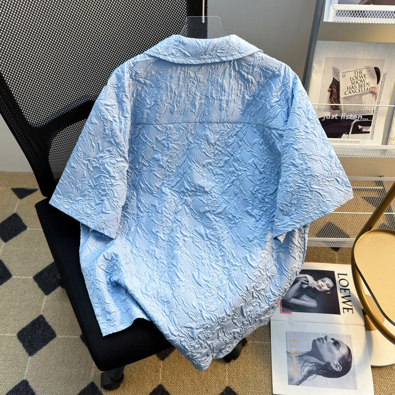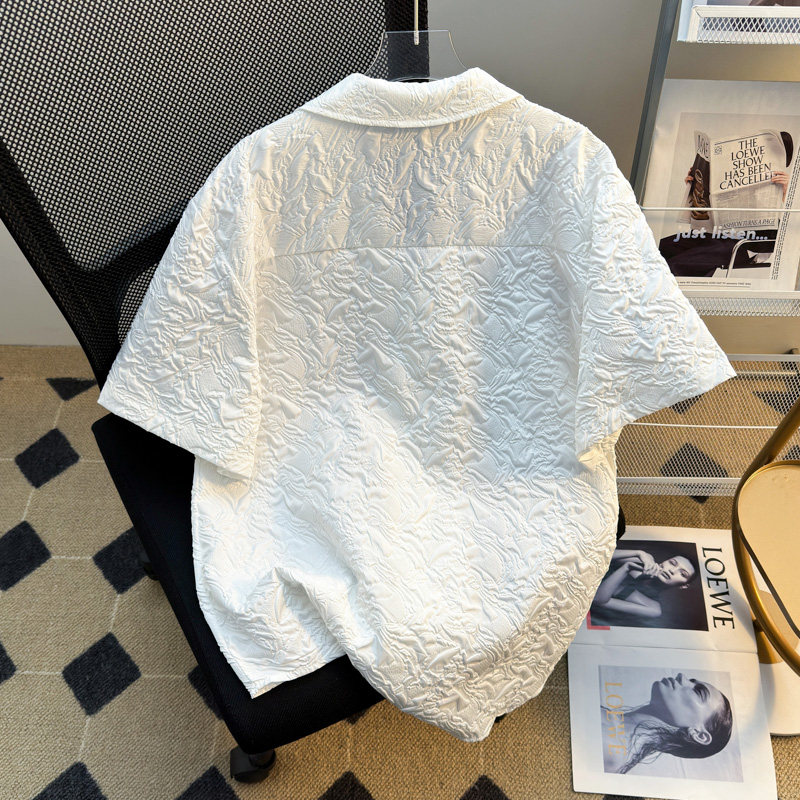 白色浮雕褶皱肌理感短袖衬衫男款高级宽松休闲古巴领衬衣半袖夏季