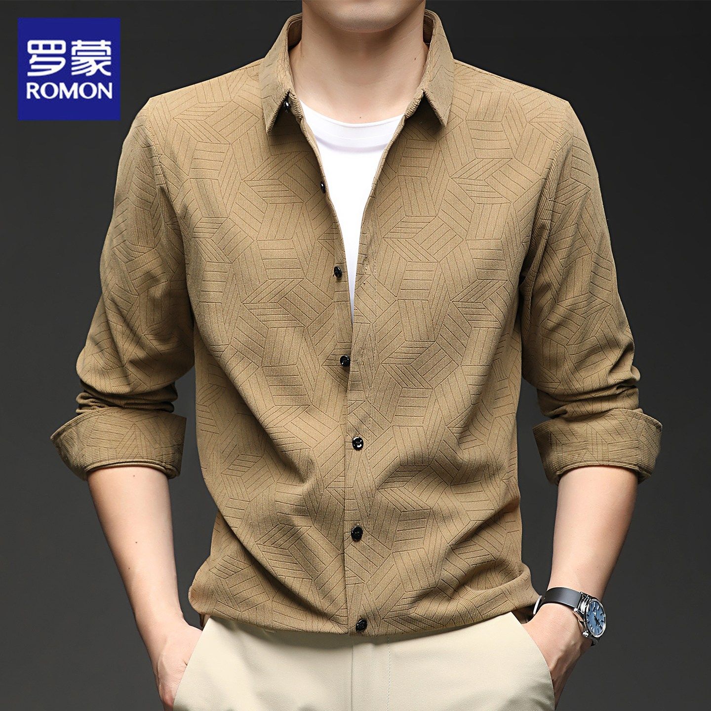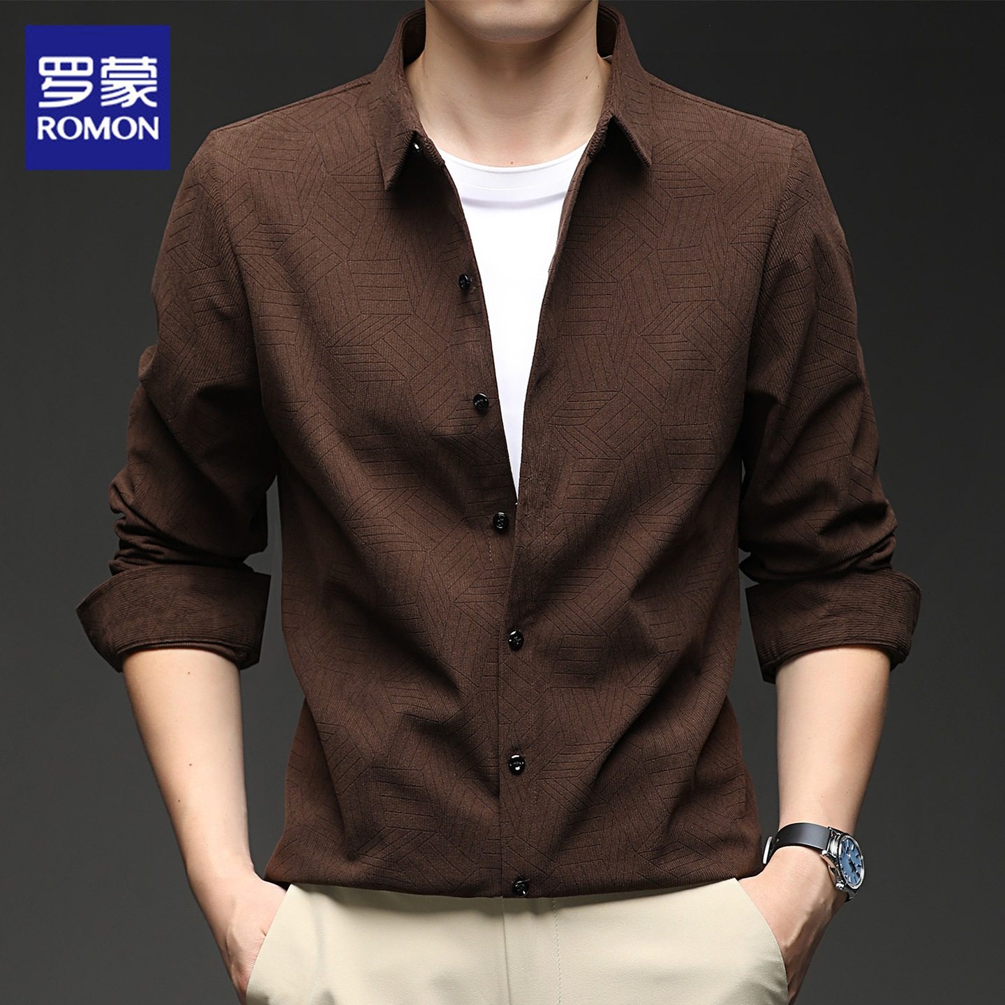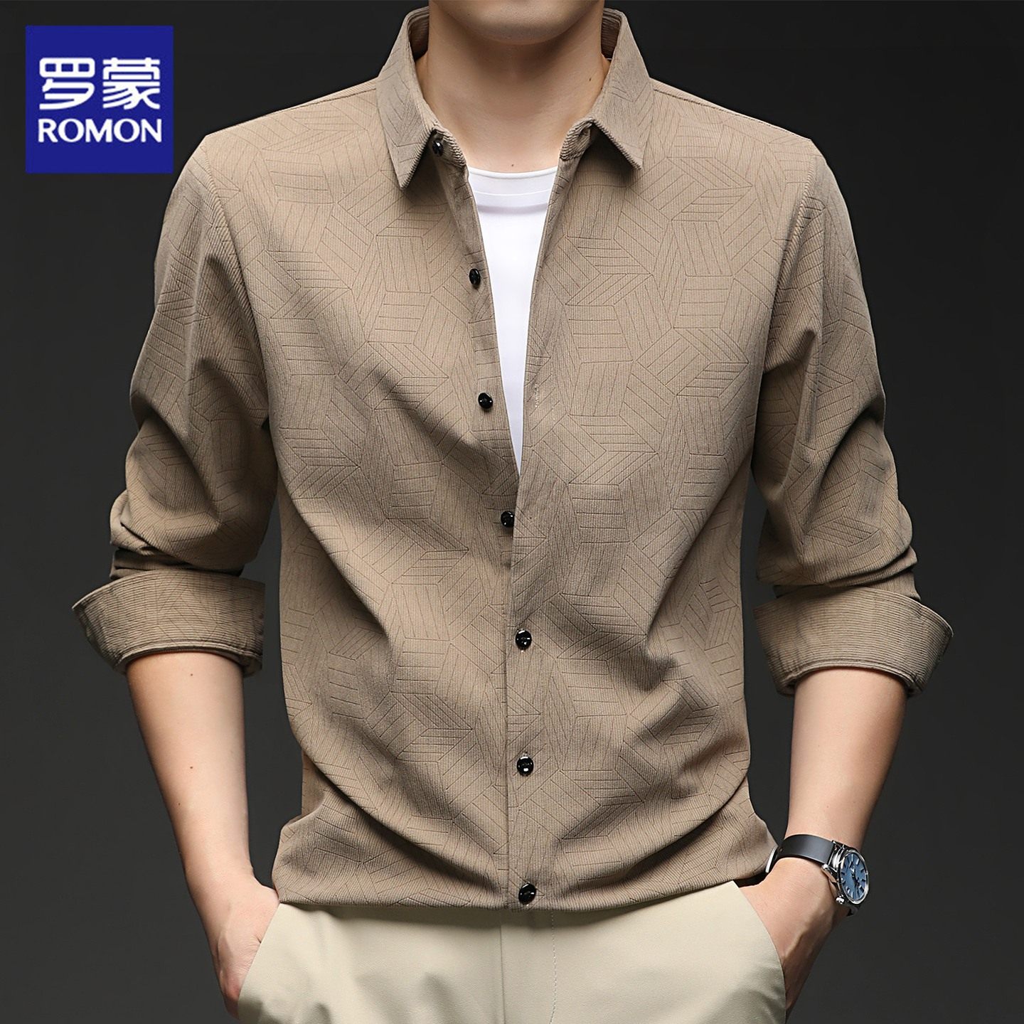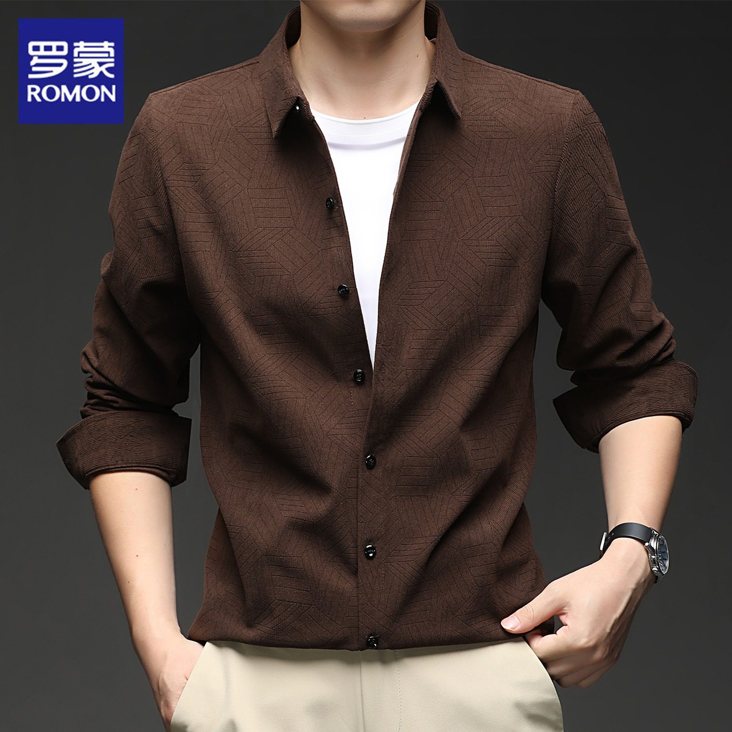 罗蒙灯芯绒长袖衬衫男士秋季新款潮流休闲商务高端暗纹免烫衬衣男