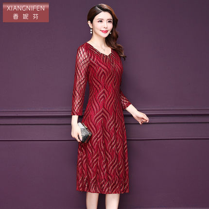 香妮芬秋季新款中年妈妈连衣裙女阔太太高贵气质修身圆领蕾丝女装
