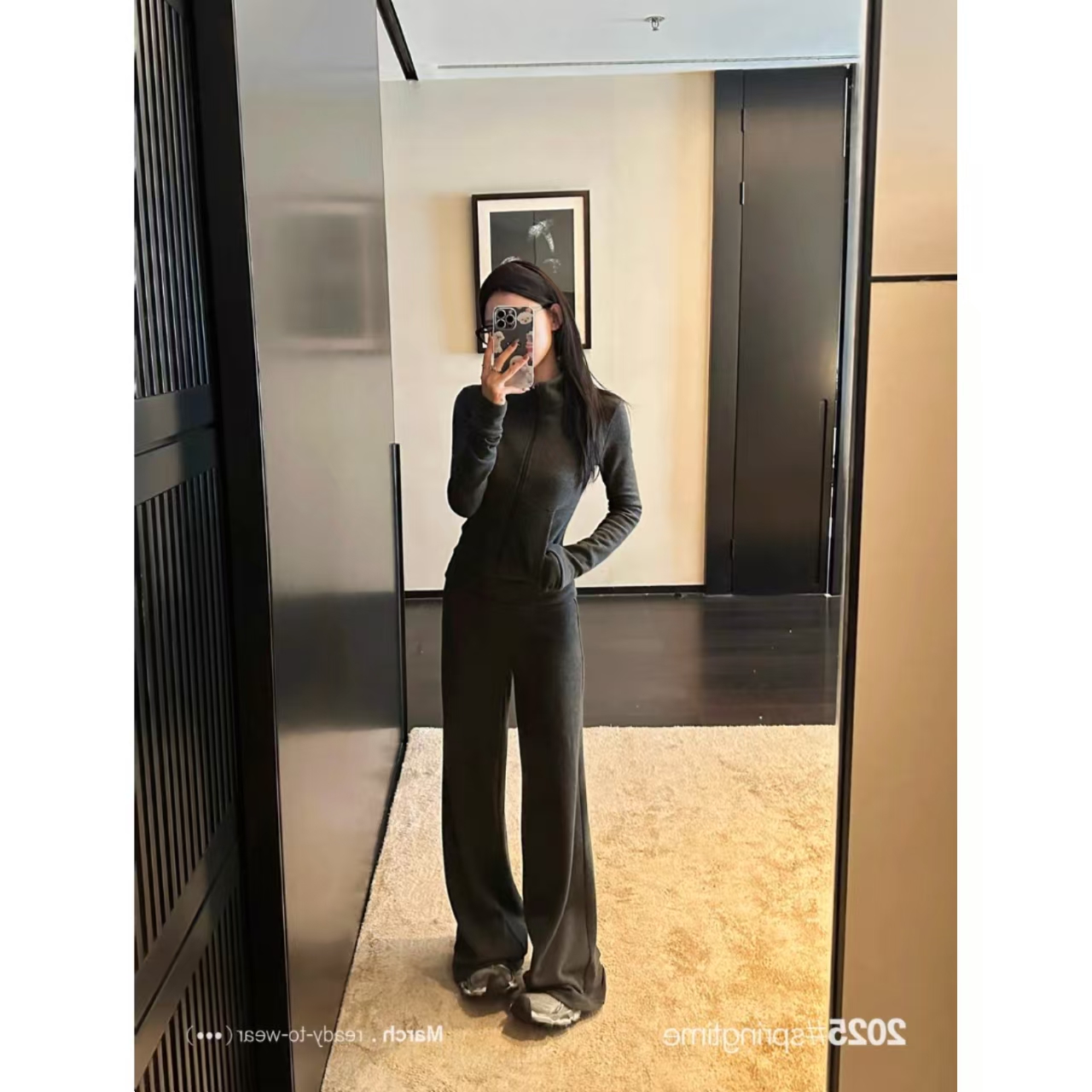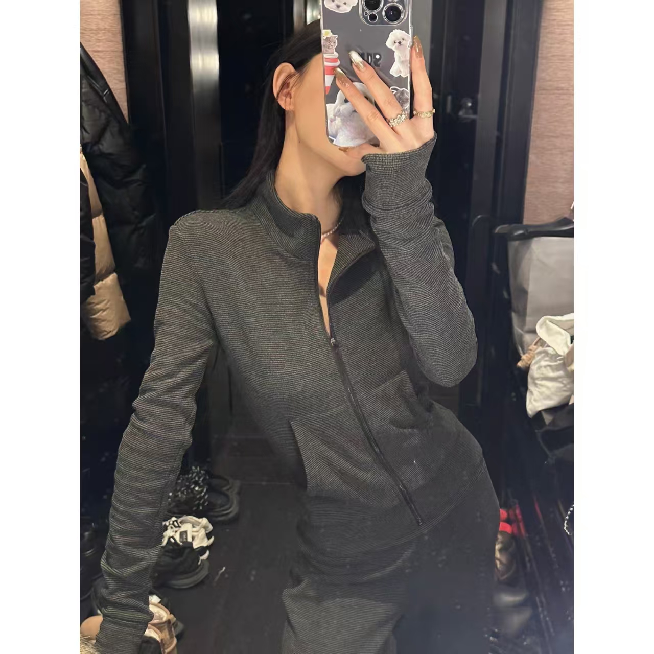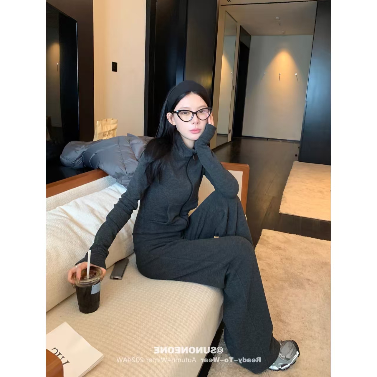 时尚慵懒风运动套装女秋季新款条纹立领修身显瘦卫衣阔腿裤两件套