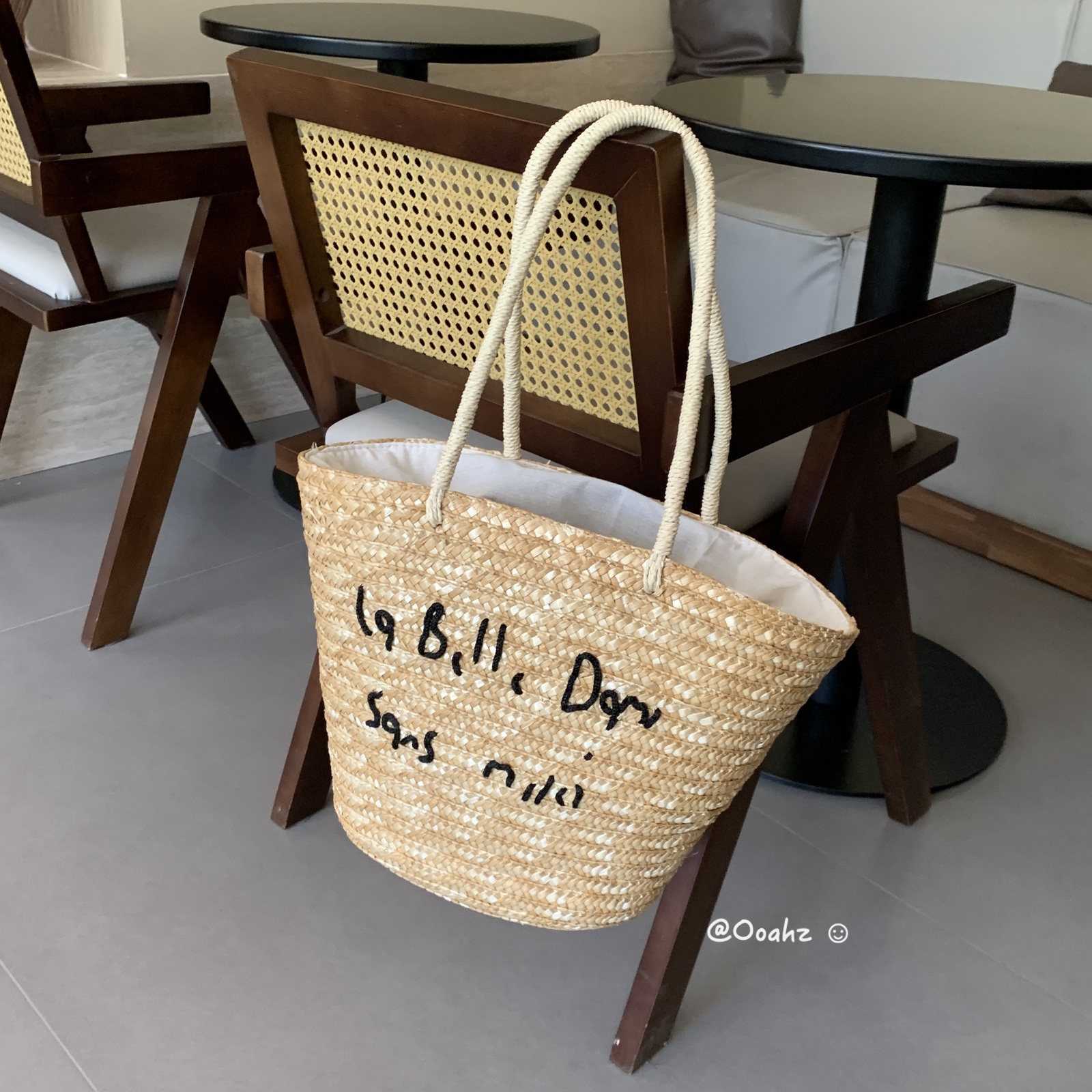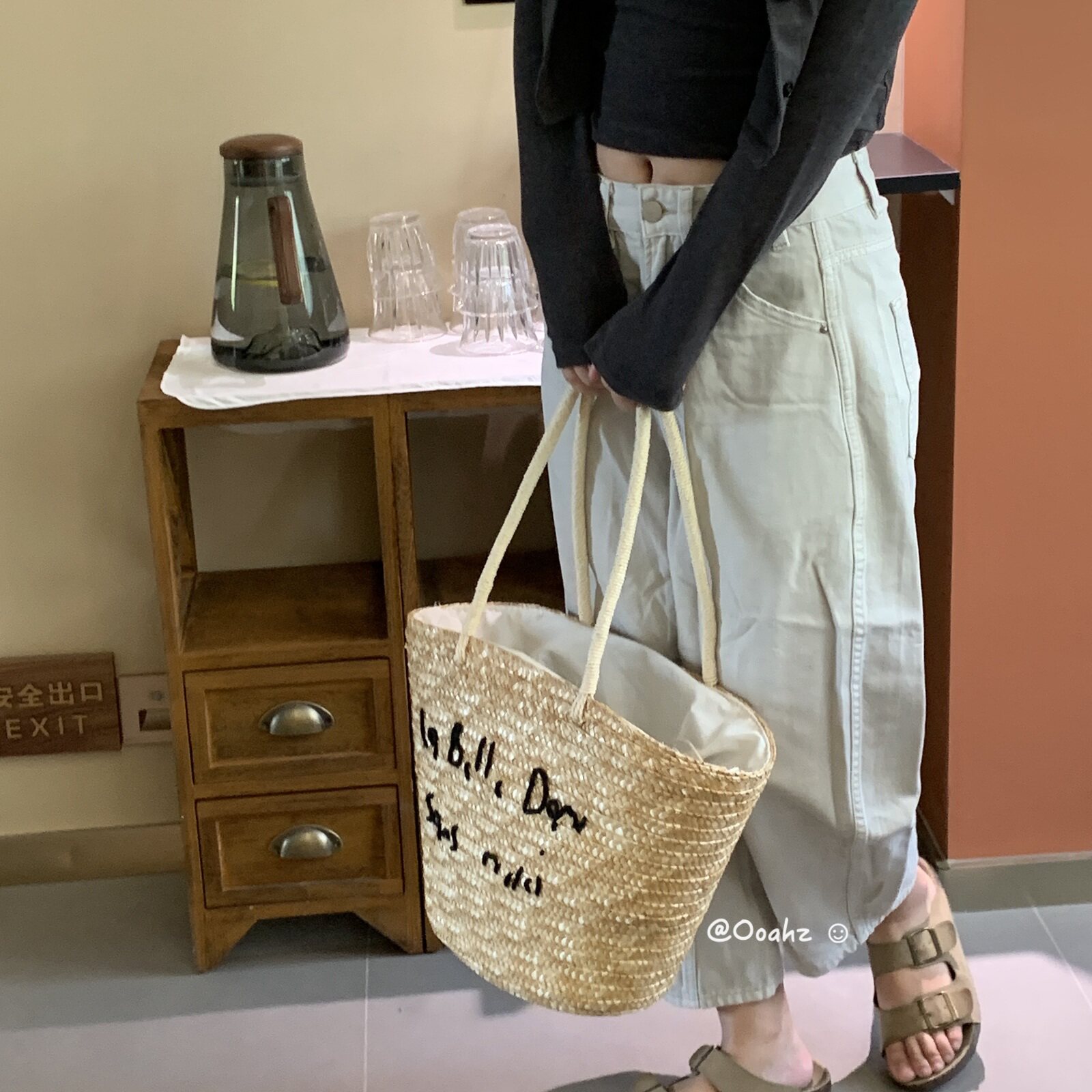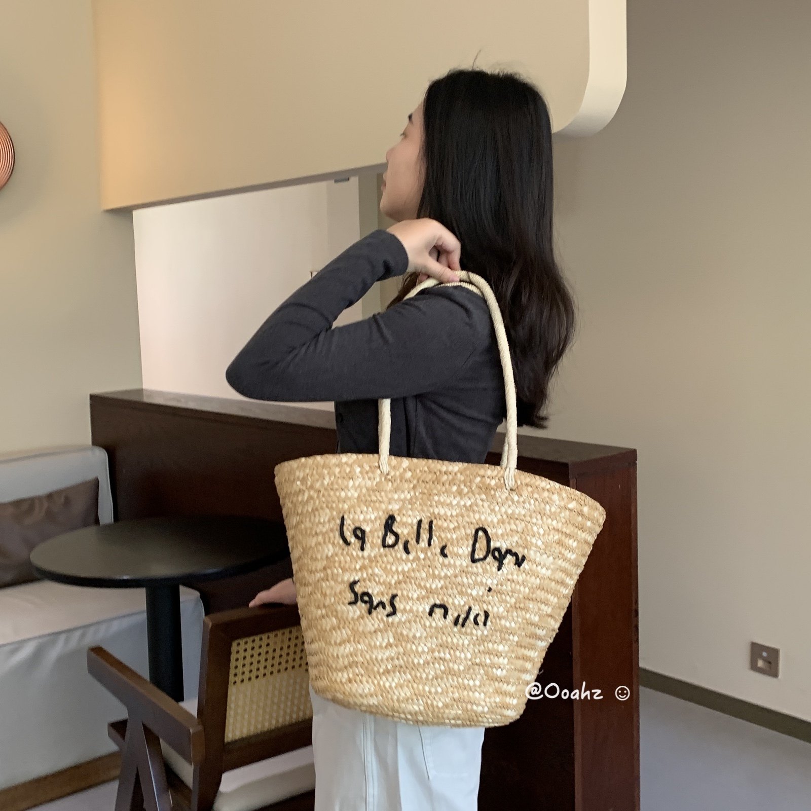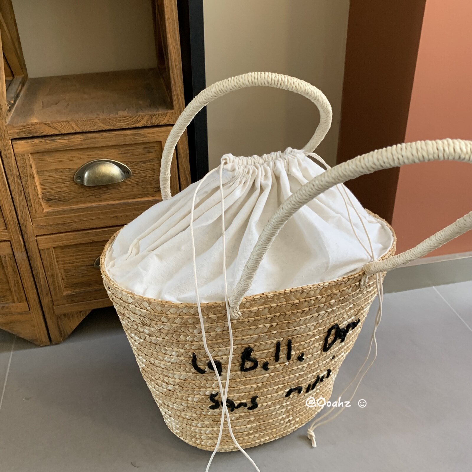 卡农故事 韩国度假风刺绣字母草编包 夏日海边手工编织单肩沙滩包