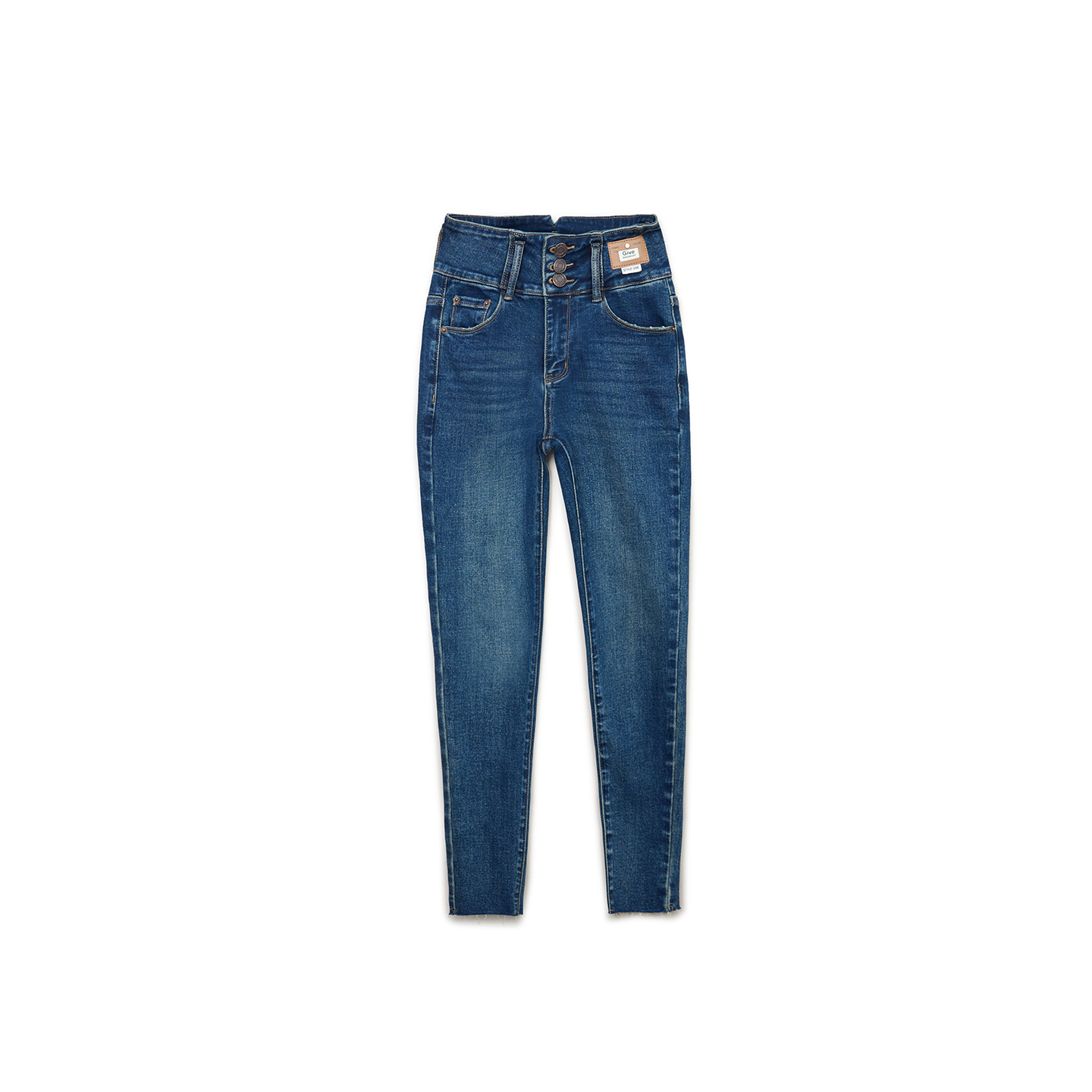 修身显腿长~三粒扣高腰牛仔裤女秋冬深蓝色紧身显瘦毛边小脚靴裤