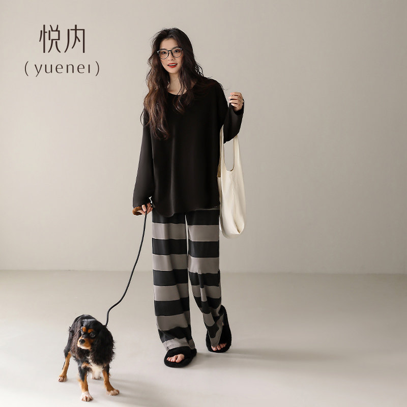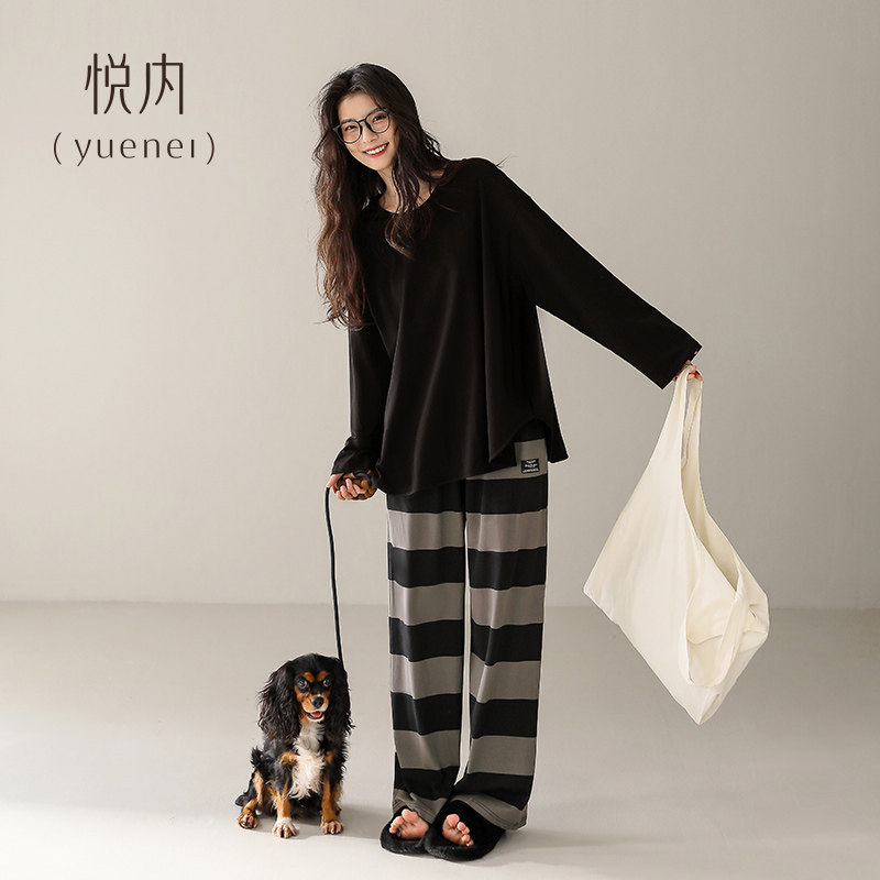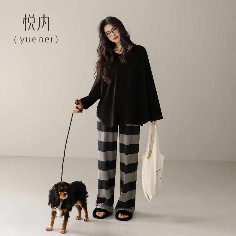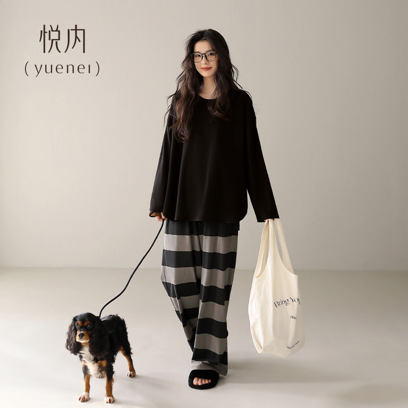 悦内带胸垫睡衣女款春秋季纯棉长袖家居服时尚休闲大码条纹可外穿