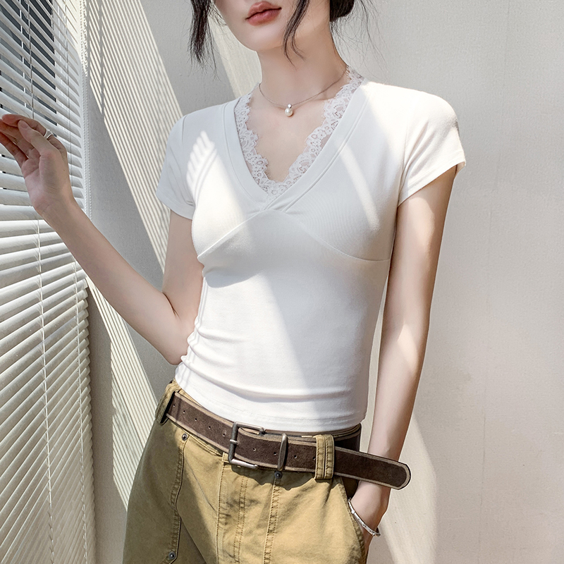 白色蕾丝v领短袖t恤女2025夏新款设计感修身显瘦减龄拼接扭结上衣