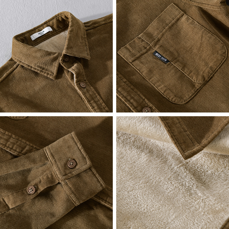 汉序秋冬季日系复古灯芯绒加绒保暖条绒长袖衬衫男宽松休闲衬衣服