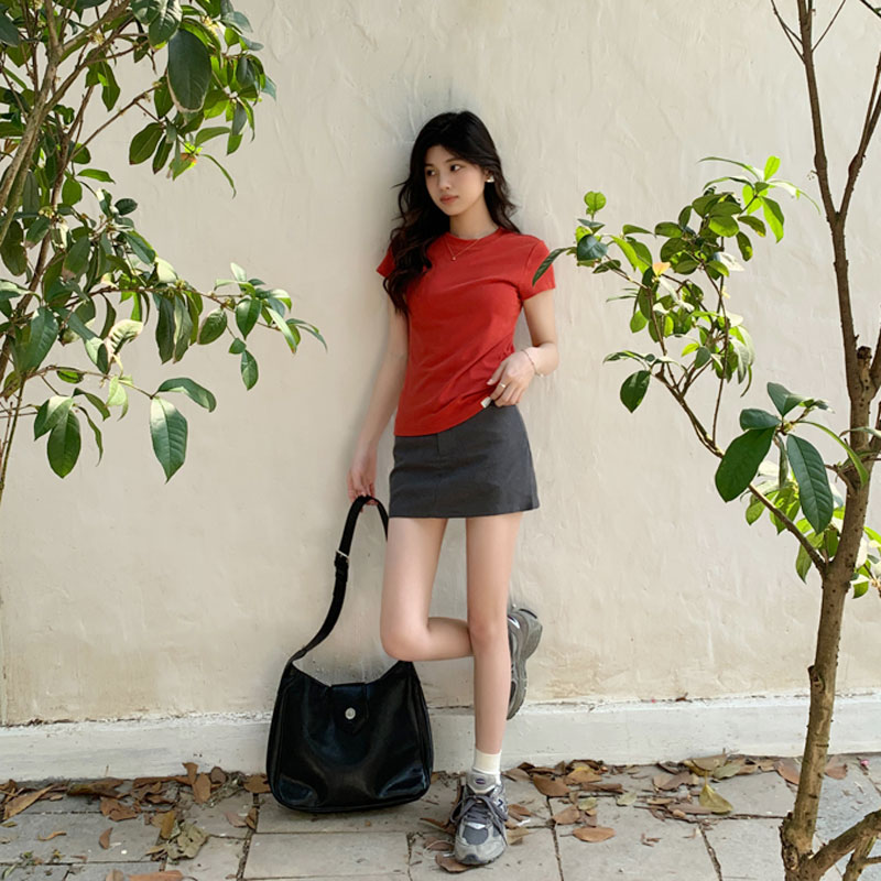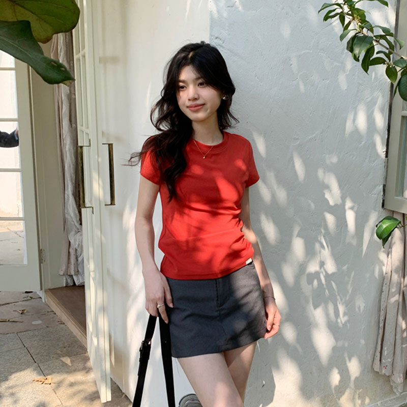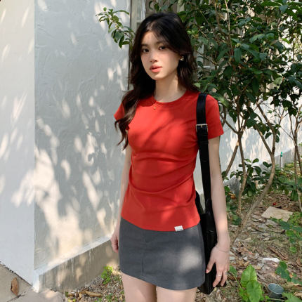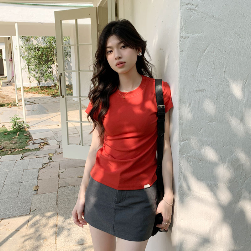 2025夏甜辣风短款砖红色短袖t恤女正肩修身圆领上衣小个子打底衫