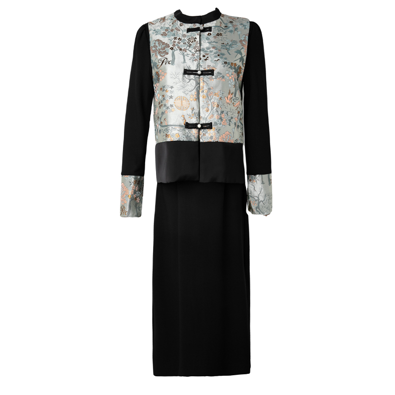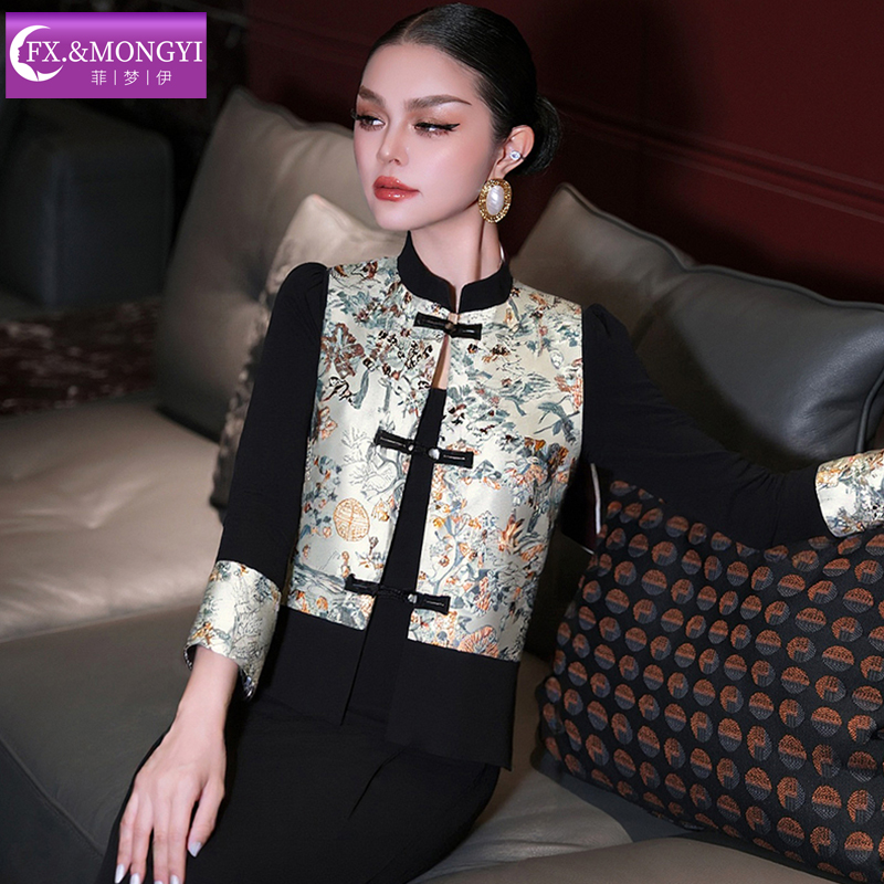 菲梦伊新中式国风时尚套装女秋季复古立领盘扣唐装上衣黑色连衣裙