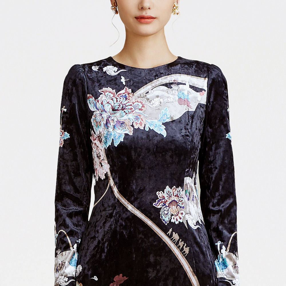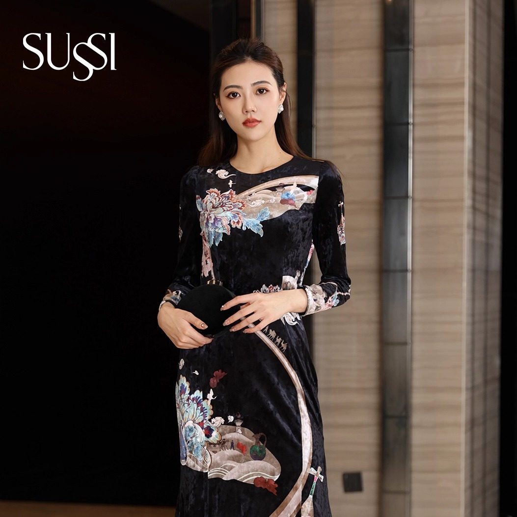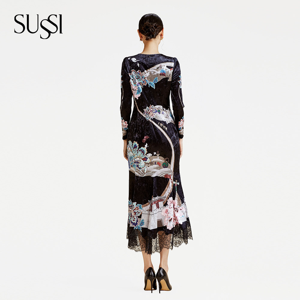 SUSSI/古色冬季新款商场同款黑色印花长袖拼接蕾丝连衣裙女