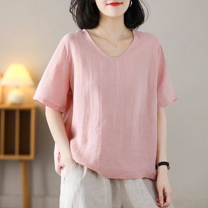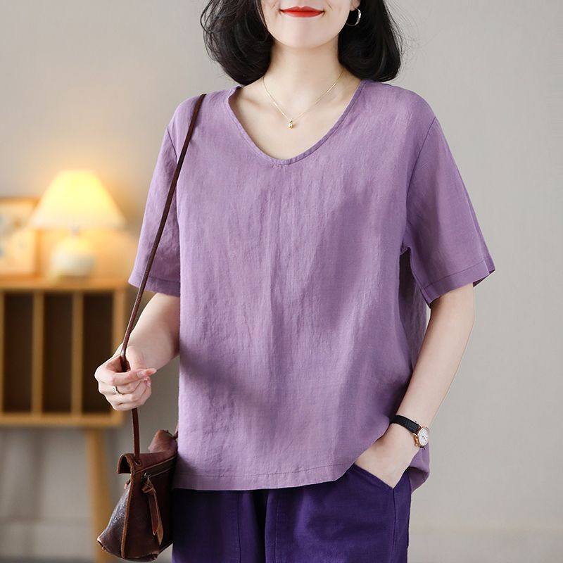 新款复古气质棉麻大码上衣宽松显瘦短袖文艺休闲纯色百搭T恤夏季