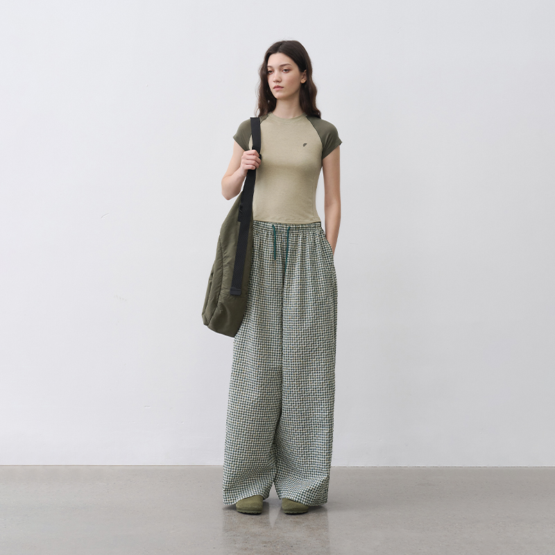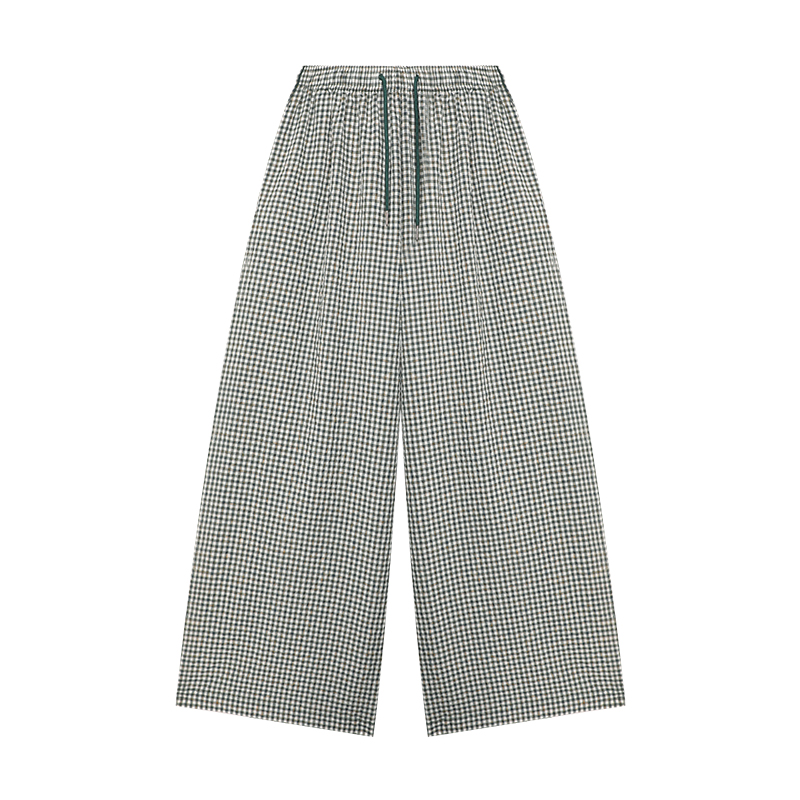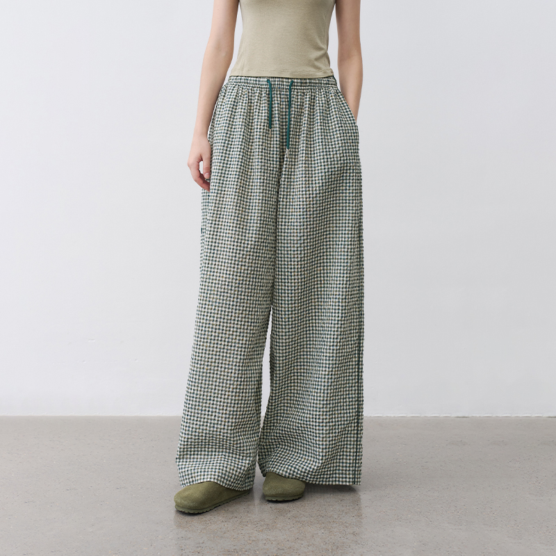 半圆女装[运动]2025夏季松紧腰休闲宽松格子阔腿直筒裤女小众感