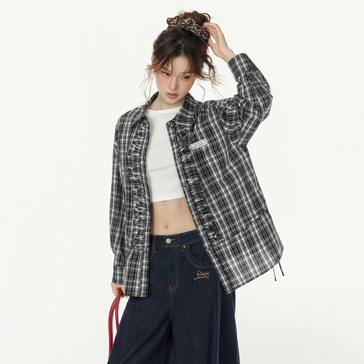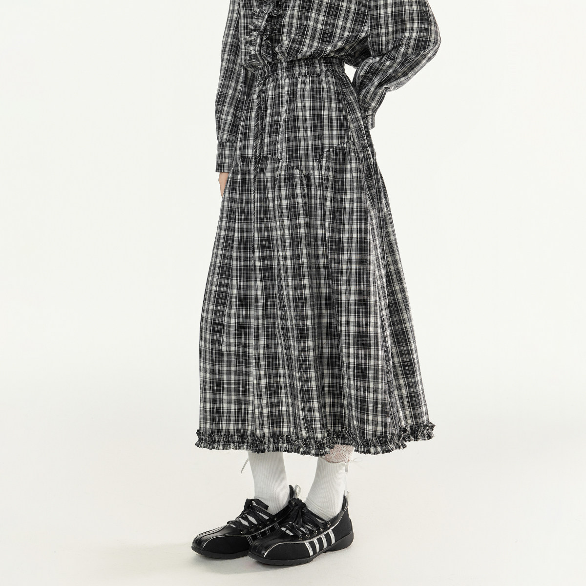 EPTISON套装女2025秋季新款学院风复古格纹宽松衬衫A字伞裙两件套