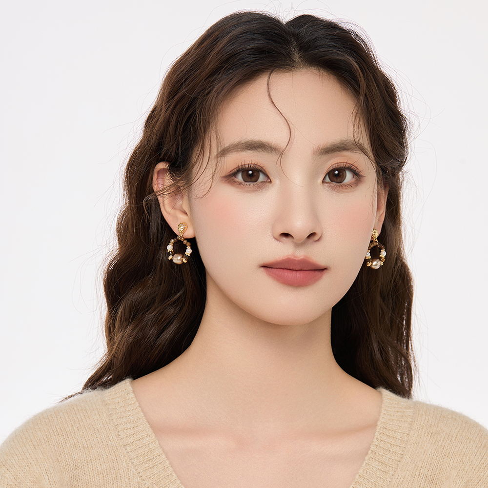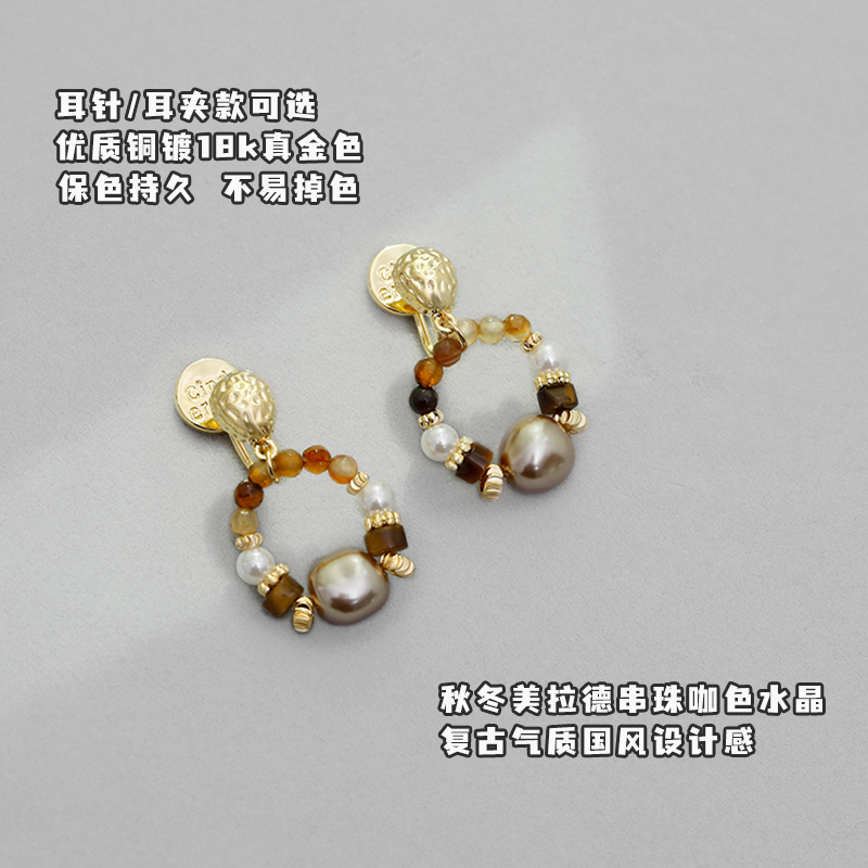 「原野之息」秋冬美拉德咖色水晶珍珠耳环蚊香盘耳夹女无耳洞耳饰