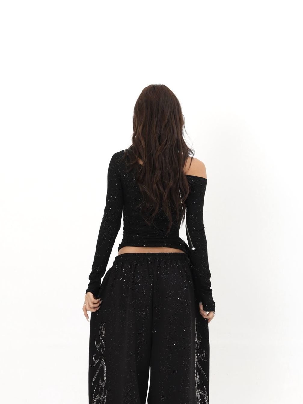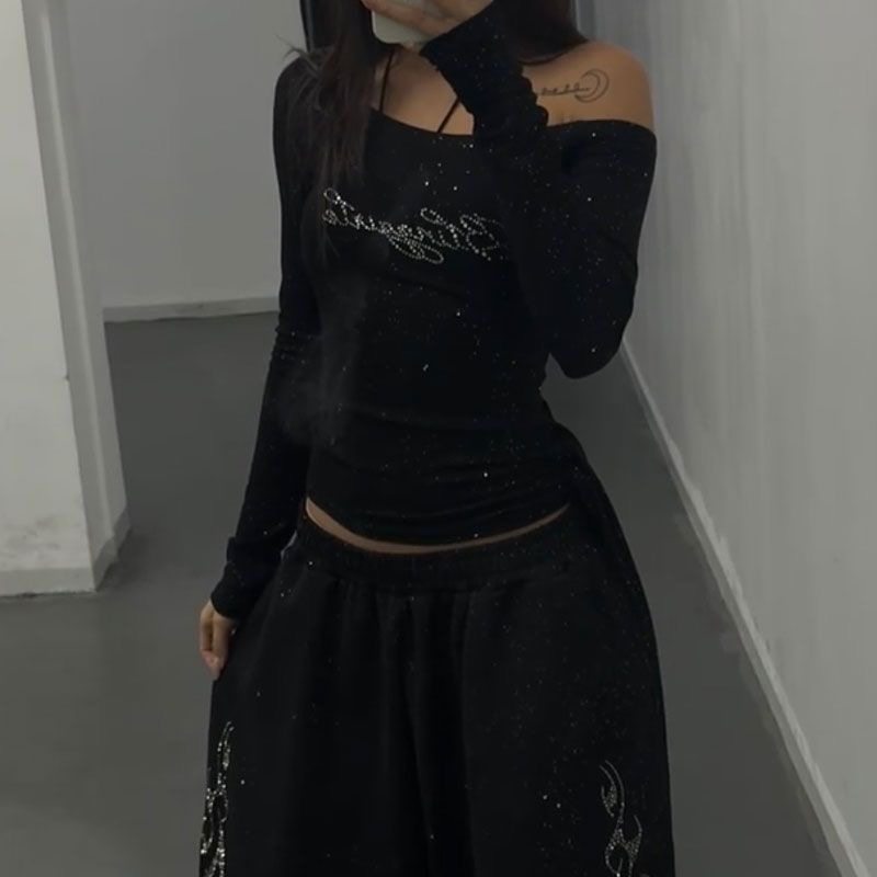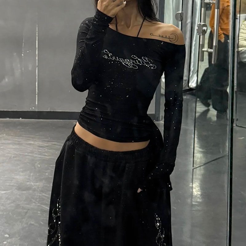 美式辣妹烫钻斜肩长袖T恤女爵士jazz纯欲风绑带修身显瘦露肩上衣