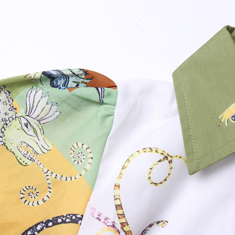 欧美风夏季款泡泡袖收腰印花单排扣修身连衣裙女A字裙长袖