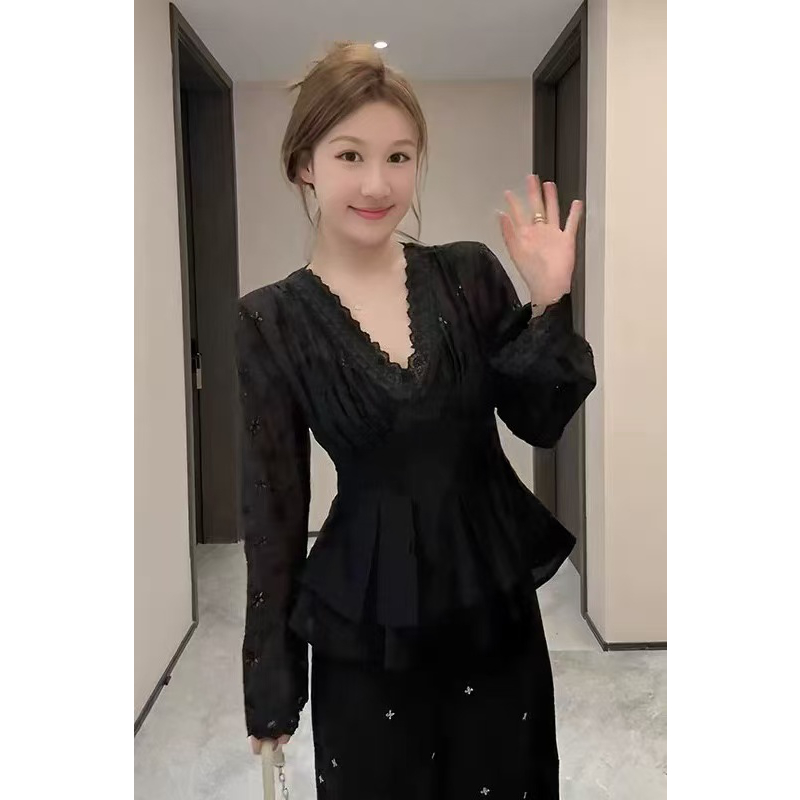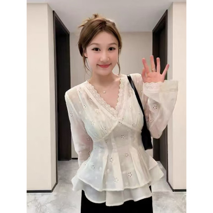 大码女装法式浪漫风V领蕾丝刺绣衬衫秋季胖mm长袖设计感气质上衣