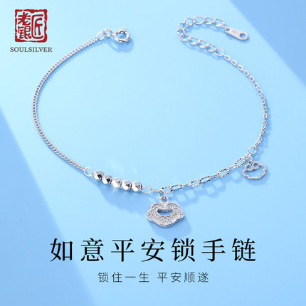 老银匠s925银平安锁手链女士碎银几两长命锁百搭祥云国潮纯银手饰