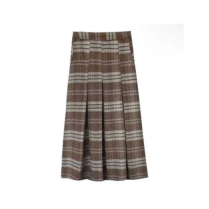 美拉德a字复古棕色毛呢格子半身裙女高腰胖mm大码显瘦艺术感长裙