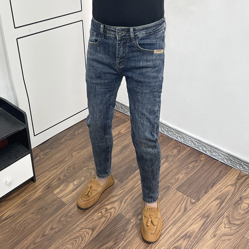 春季新款韩版猫须蓝色修身牛仔裤男青年简约水洗弹力小脚裤九分潮