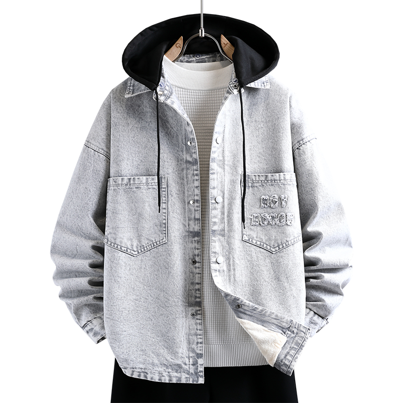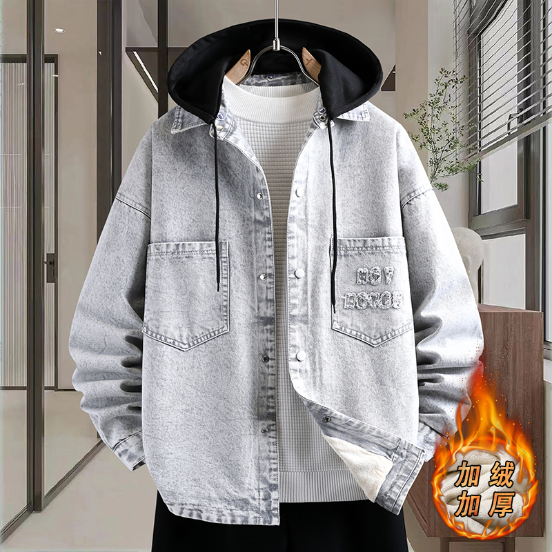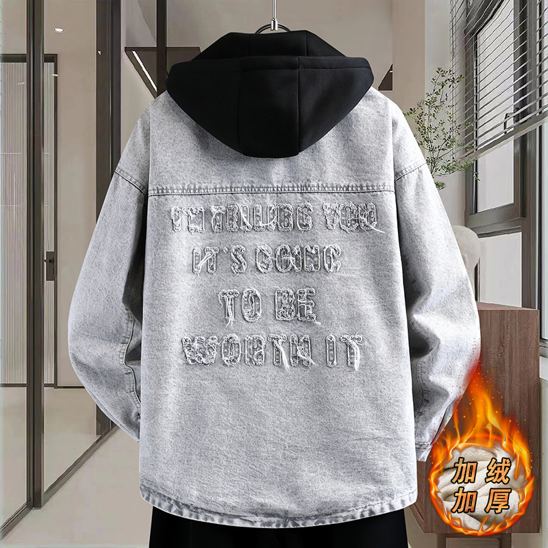 字母刺绣牛仔夹克男青少年冬季2025新款加绒加厚外套宽松连帽棉服