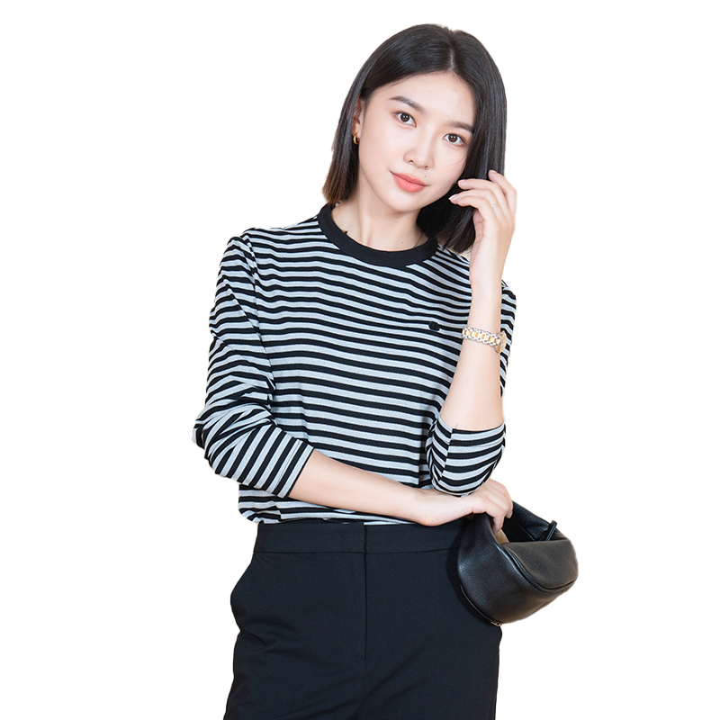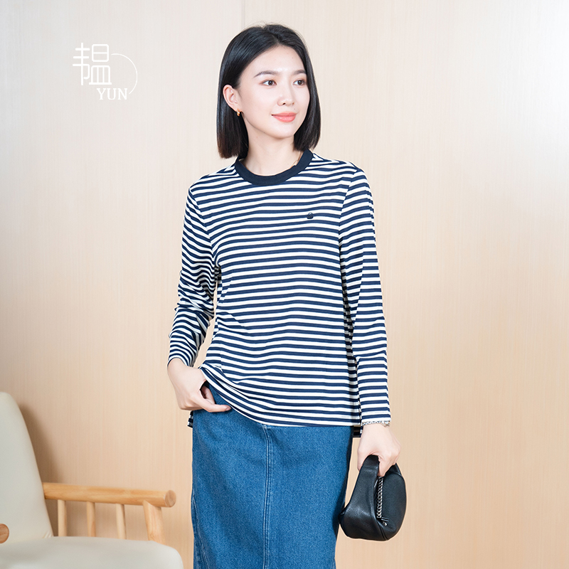 【YUN】韫2024秋季新品女装经典圆领简约亲肤感长袖条纹T恤打底衫