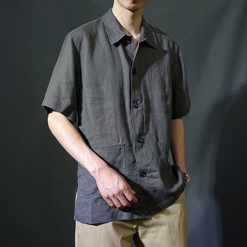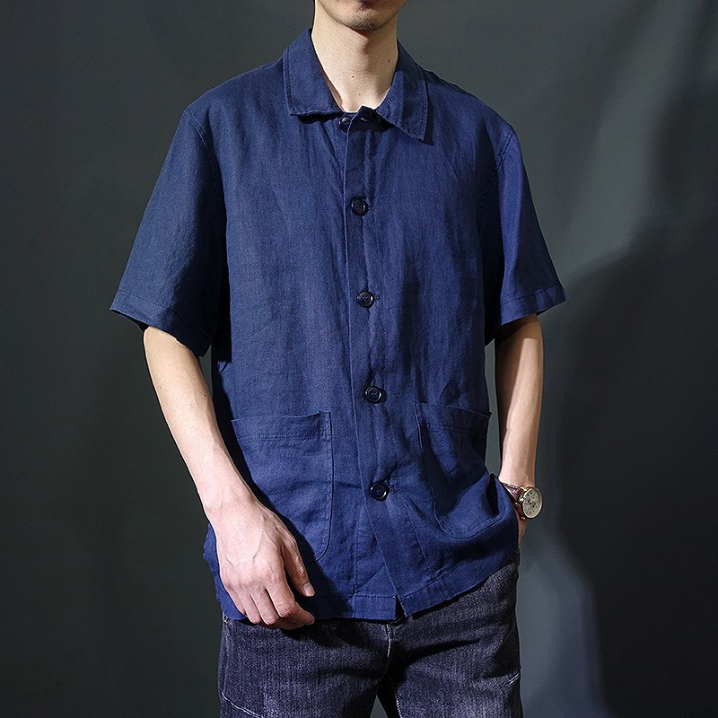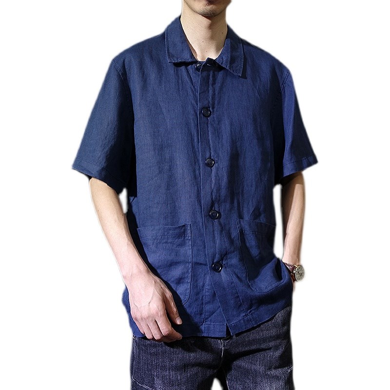 夏季男士纯亚麻方领短袖衬衫大口袋休闲宽松复古薄款透气半袖衬衣